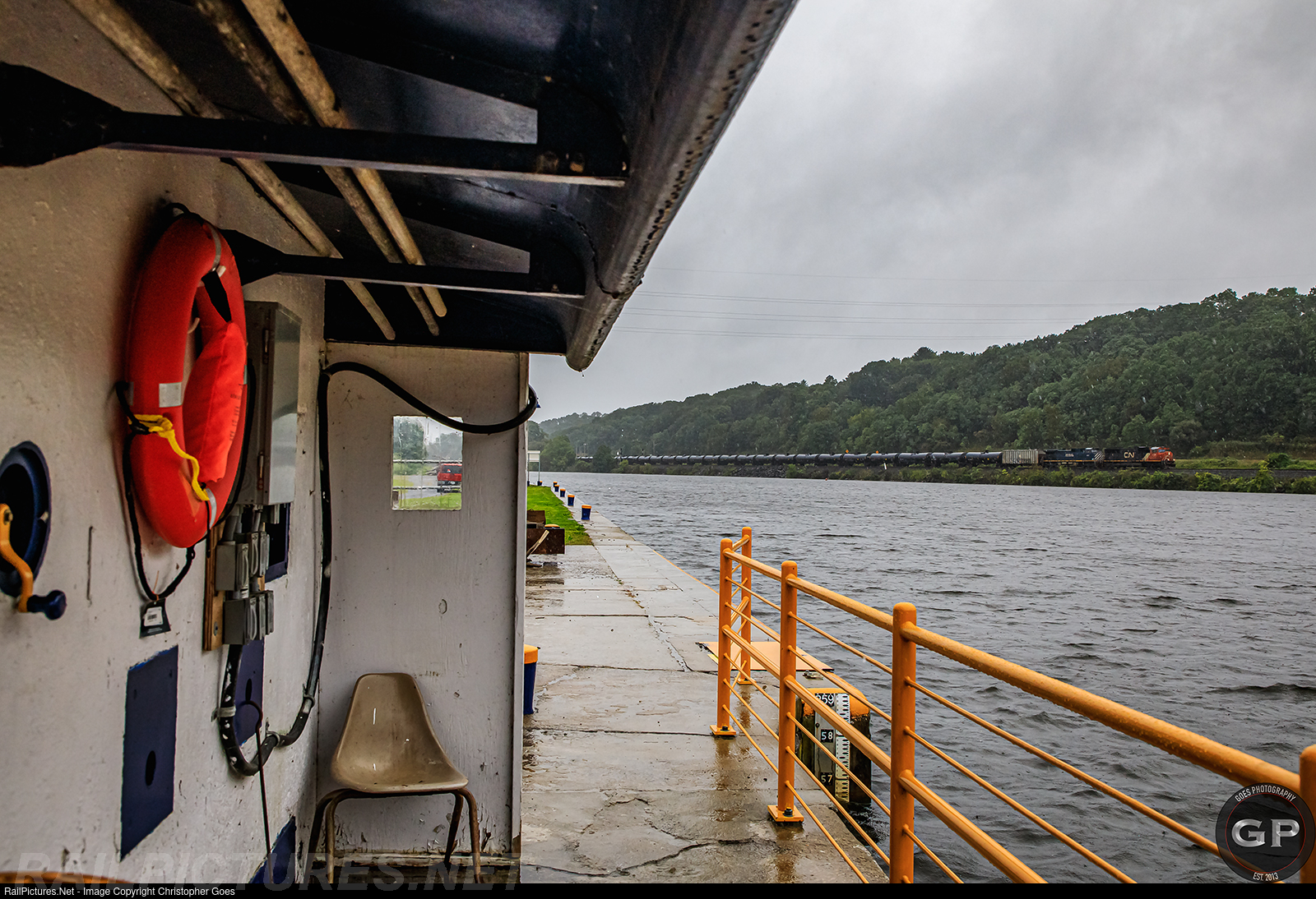Rain was falling at it's heaviest as CN 5701 & BCOL 4651 pull B781 through CP-173 along the Mohawk River at Erie Canal Lock 10 with NYS-DOT colors showing bright.