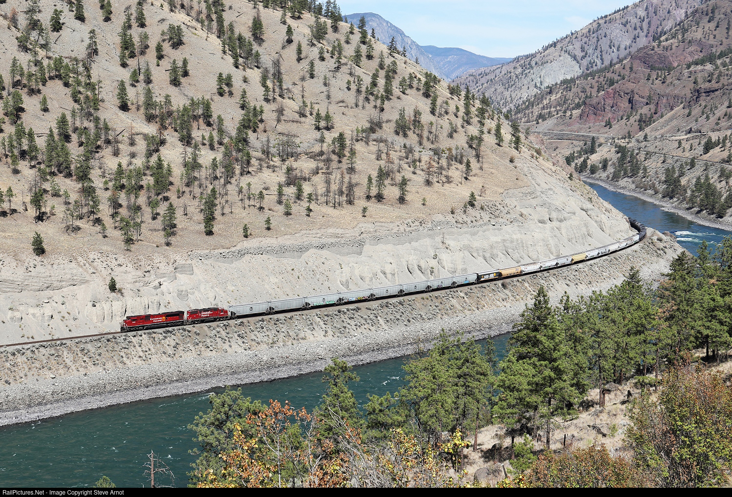 CP SD70ACU 7028 and GP38-2 3070 leads a westbound freight through the Thompson River Canyon.