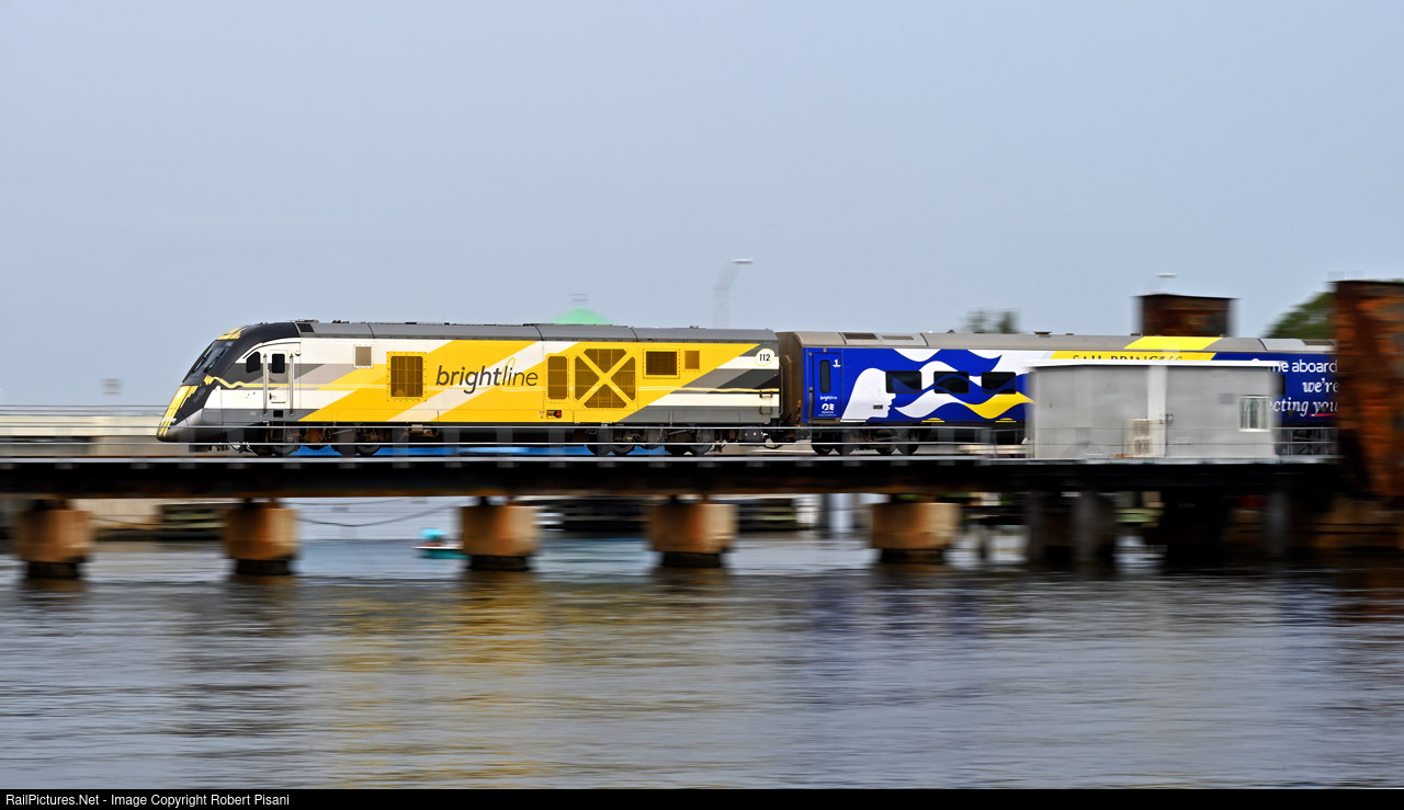 | Brightline 112 crosses the St. Lucie River at Stuart, FL. The train is on the bascule span that allows marine traffic to pass. This bridge is a point of contention for both the railroad and the city. It is the only single-track section remaining on FEC main between Miami and Cocoa where Brightline operates. The presence of Brightline has now caused the bridge to be lowered far more frequently than it used to, which displeases boaters. A double tracked replacement bridge with better clearance is planned. |