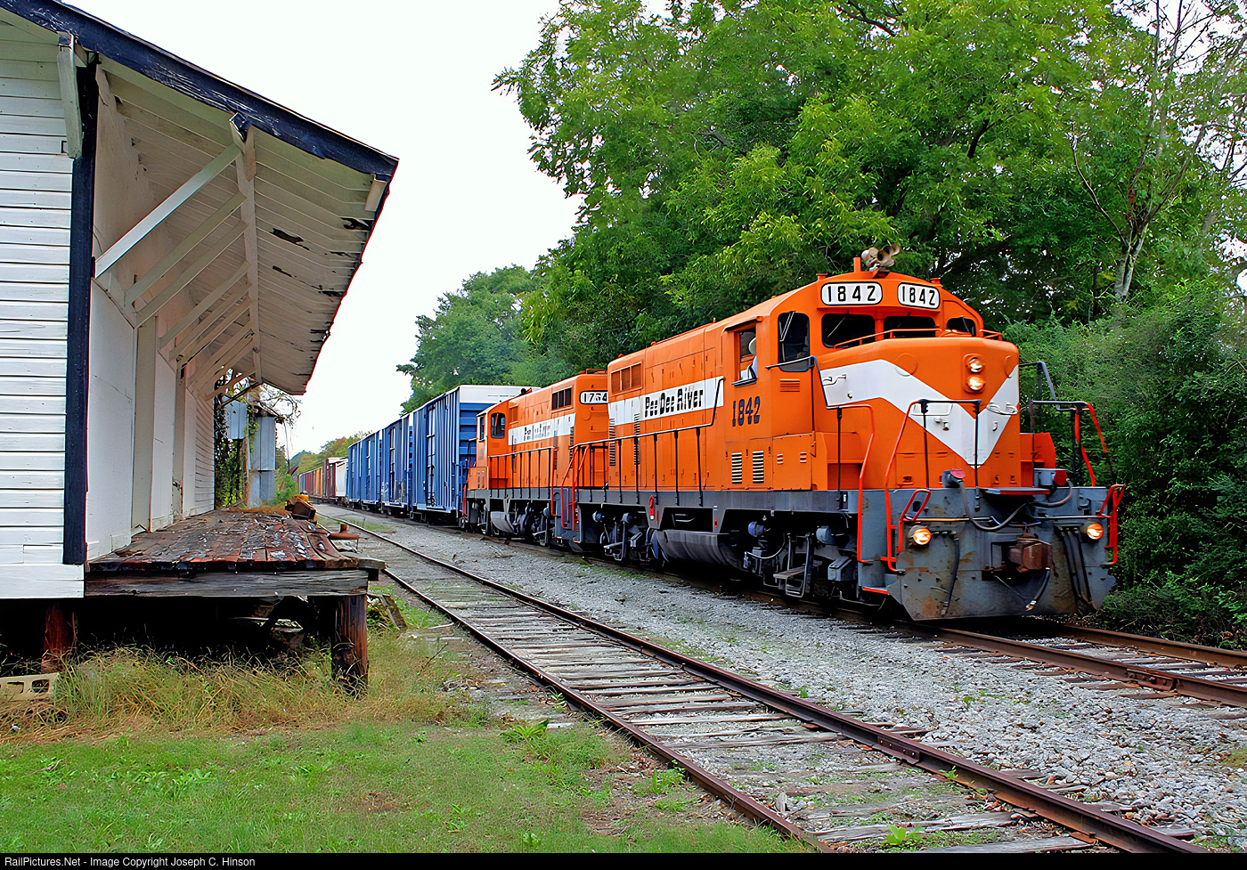 | In October 2004, the Pee Dee River Railway passes the old freight depot in Tatum, South Carolina. PDRR 1842 is a EMD GP16 built in 1952 as SAL GP7 1795. She remains in service on the shortline railroad in 2024. |