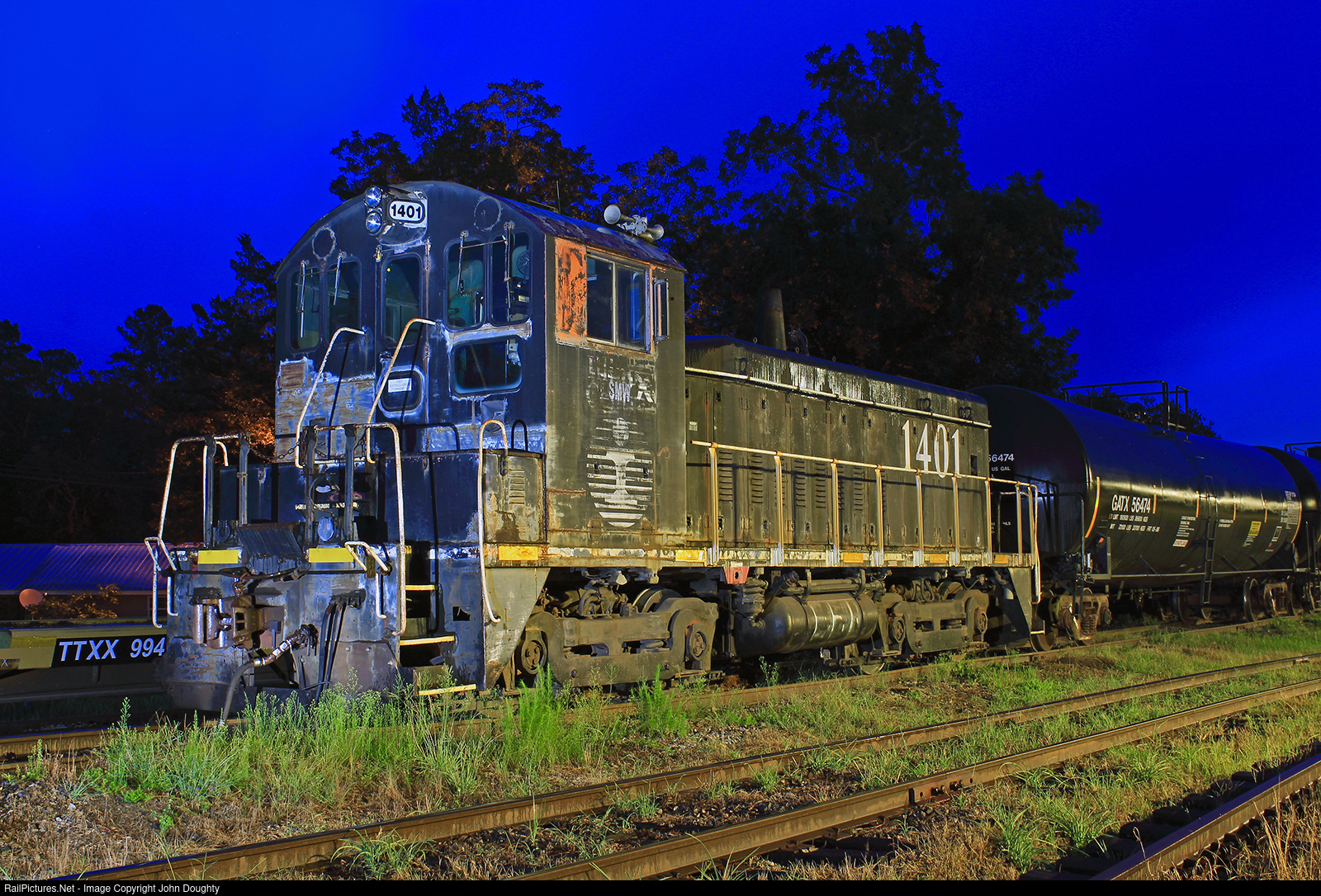 The old Illinois Central 1401, now with SMW marking on the cab, rests in the St. Mary Railroad West yard, as the blue hour fades to night in Waresboro, Georgia.
