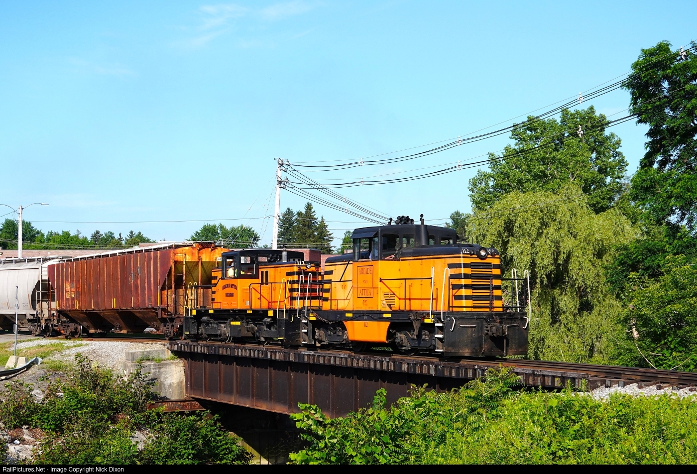 Arcade & Attica's classic GE center cabs cross the Cataraugus Creek on their way out of Arcade, NY. This was taken as part of a photo charter held to honor the center cabs on the eve of their demotion from full-time freight handling. The A&A, long the land of center-cabs, finally acquiesced and purchased their first road switcher, an ex-D&H RS-3u, to replace doubleheading the little GEs on revenue freight. While the #112 is the physically larger locomotive, it's only 65 tons, and the smaller #113 is an 80-tonner. Also, note the faded CNW logo on the rusty covered hopper immediately behind the power.