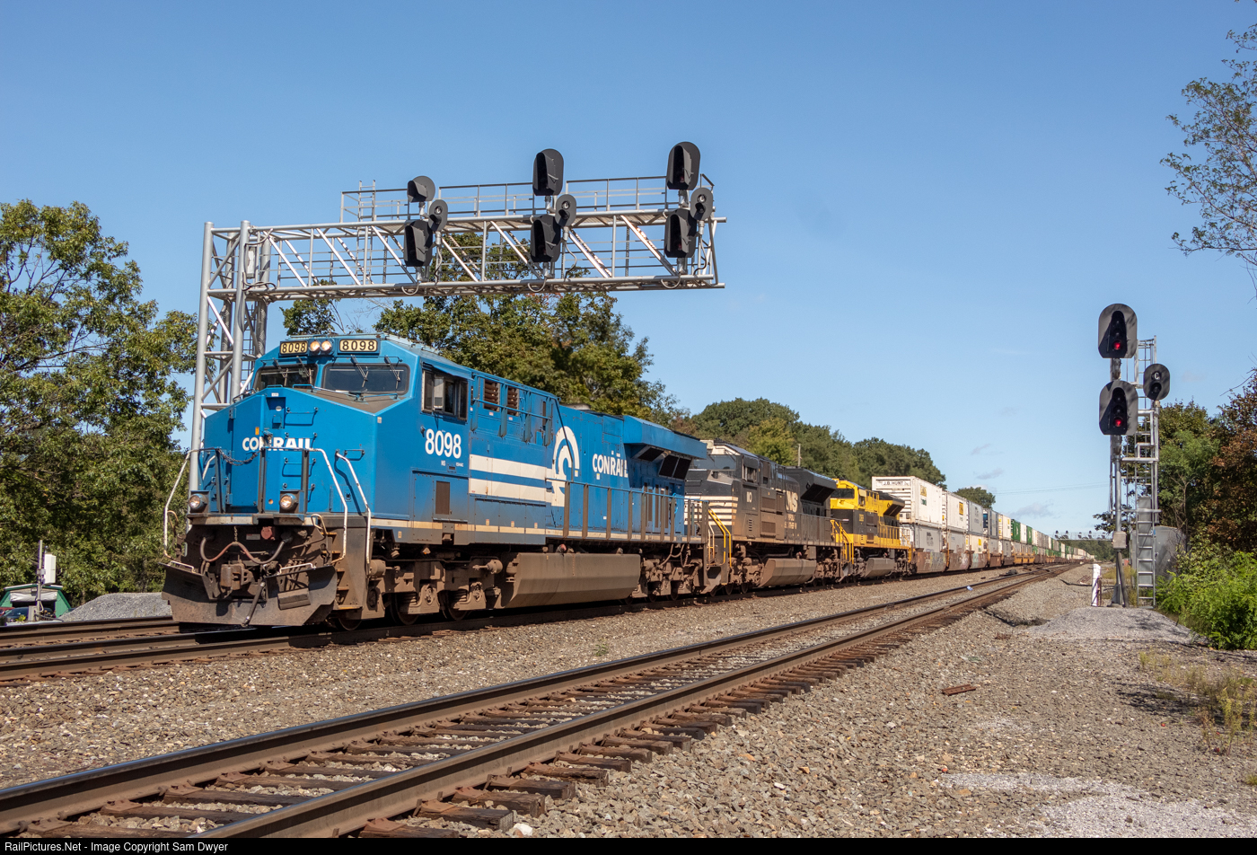 NS 25G, a hotshot intermodal to Chicago knocks down the signal at Cresson with NS 8098, the Conrail heritage unit, and NS 1069, the Virginian heritage unit.
