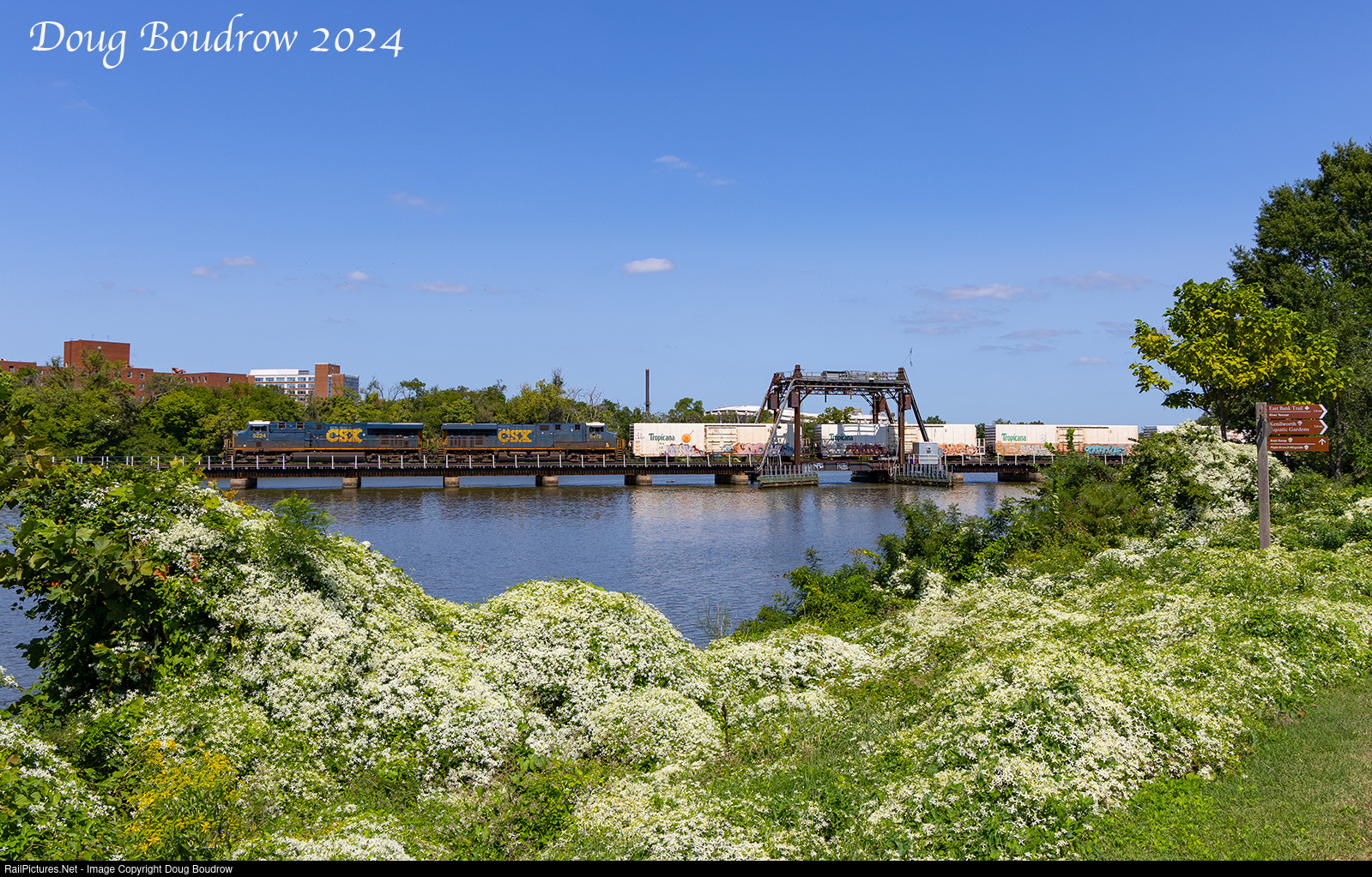| CSX priority intermodal train I031 (North Bergen, NJ to Jacksonville, FL Duval Ramp) is seen crossing Benning Draw over the Anacostia River in the District of Columbia with Tropicana juice cars on the headpin. |