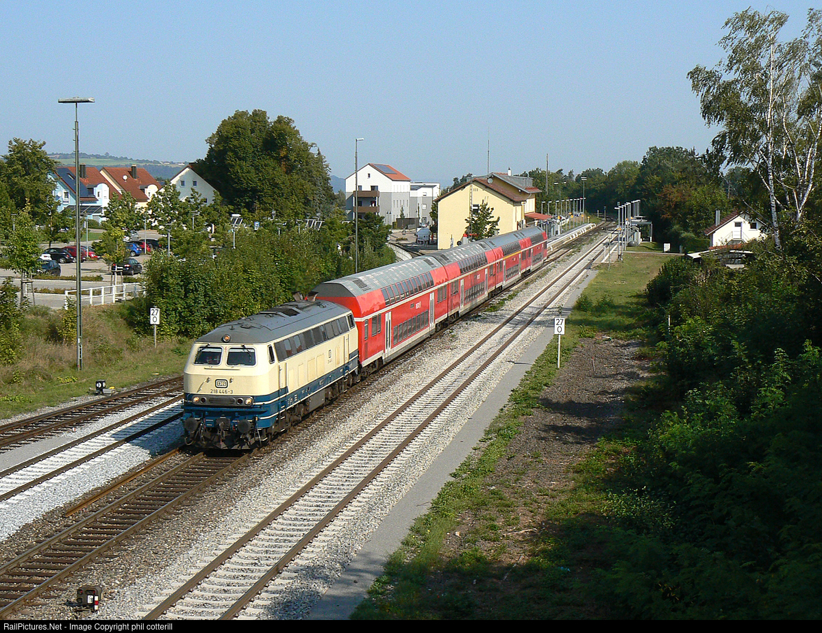 | 218446 heads the 0840 Hof to Munich service at Maxhutte-Haidhof, in Bavaria. An electric loco will take over at Regensburg for the run to Munich. |