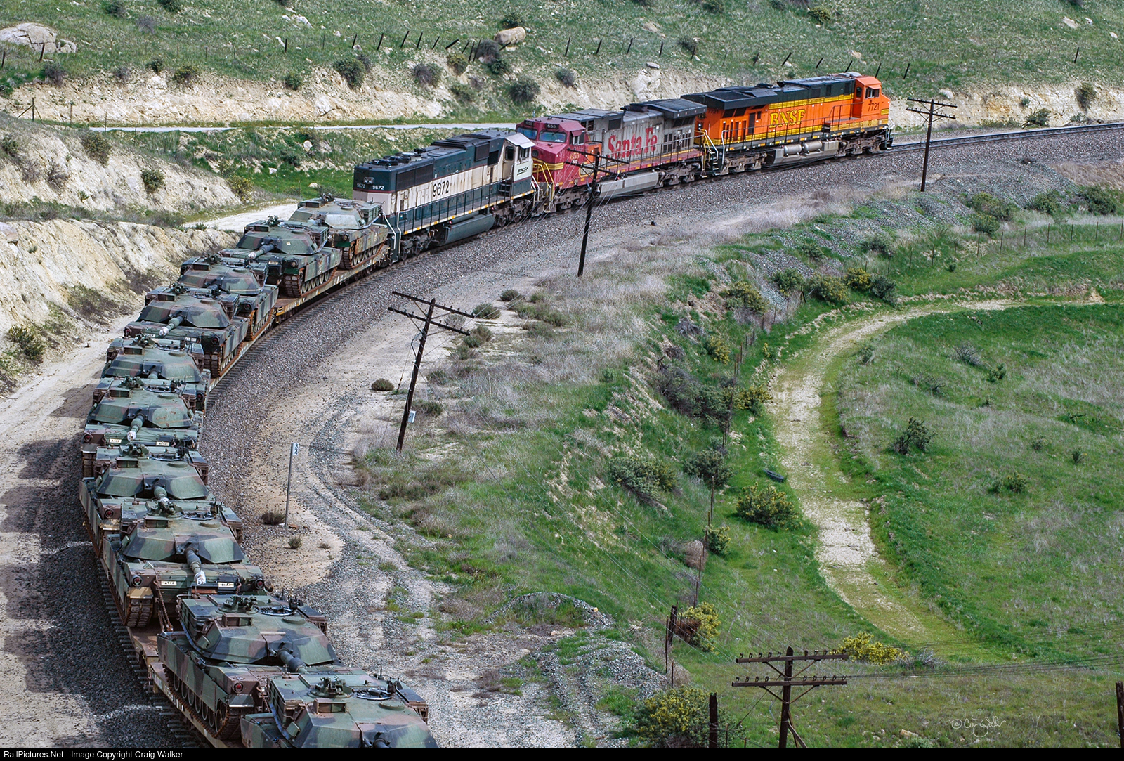 Descending from Tehachapi (at an elevation of 3,970 feet [1,210 m]) down to Bakersfield (at 404 ft [123 m] of elevation) is BNSF Railway train U-PADHLG1-01, a unit train of DODX flats carrying M1 Abrams tanks from Paducah KY to Herlong CA (a census-designated place in California's Lassen County, at the extreme eastern edge of the Sierra Nevada Mountain Range and home of the Sierra Army Depot, which serves as the Army's End of First Life Center and the CONUS-based Army Prepositioned Stock Site). This train, powered by BNSF ES44DC 7721, Dash 9-44CW 655 and SD70MAC 9672 (with Dash 9-44CW 4380 on the rear), exits Tehachapi's Tunnel 2. (Bealville, California – March 6, 2008)