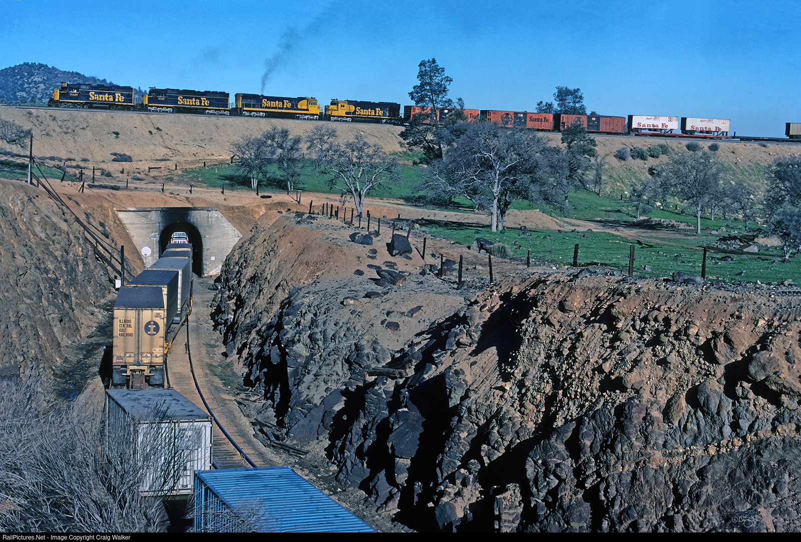 An eastbound Atchison Topeka & Santa Fe Railway freight passes over itself as it rounds the Tehachapi Loop (called Walong in the Southern Pacific timetable, on whose trackage the ATSF has trackage rights) on its climb over the Tehachapi Mountains. The train is passing over itself as the power (GP35 3429, SD45 5517, U36C 8739 and SD45 5525) is crossing above Tunnel 9 as the latter-half of the train is still exiting the tunnel. I've been to Pennsylvania's Horseshoe Curve, but the line across the Tehachapis eclipses that as it features at least five horseshoe curves that are tighter than the one in Pennsylvania, as well as this 360º+ loop built to gain altitude in a small area, unique in American railroading. Sadly, getting this access to this area is no longer possible because the owner of this land got tired of irresponsible railfans. (Keene, California – March 19, 1978)