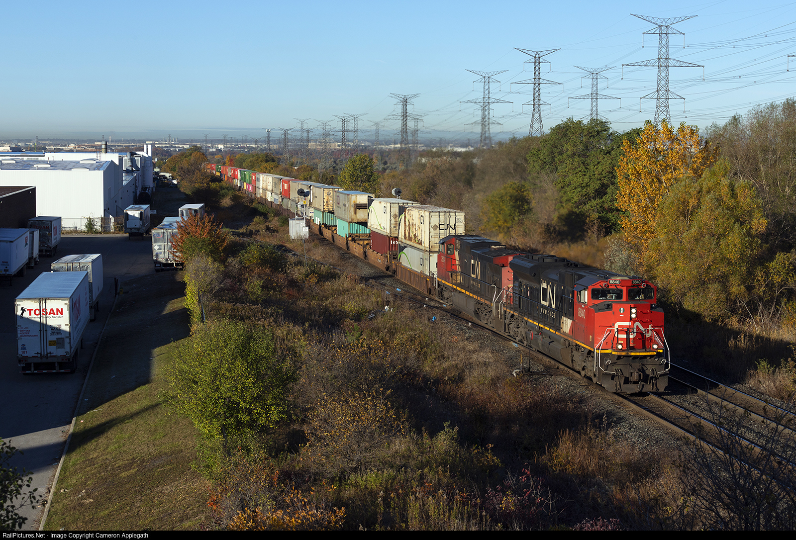 | Here we see a CN stack train heading east past the searchlights at mile 2 of the Halton Sub, shot from the Weston Rd overpass on a crisp fall morning. Not sure if this was a northbound for the west coast or an eastbound for the port of Montreal... |