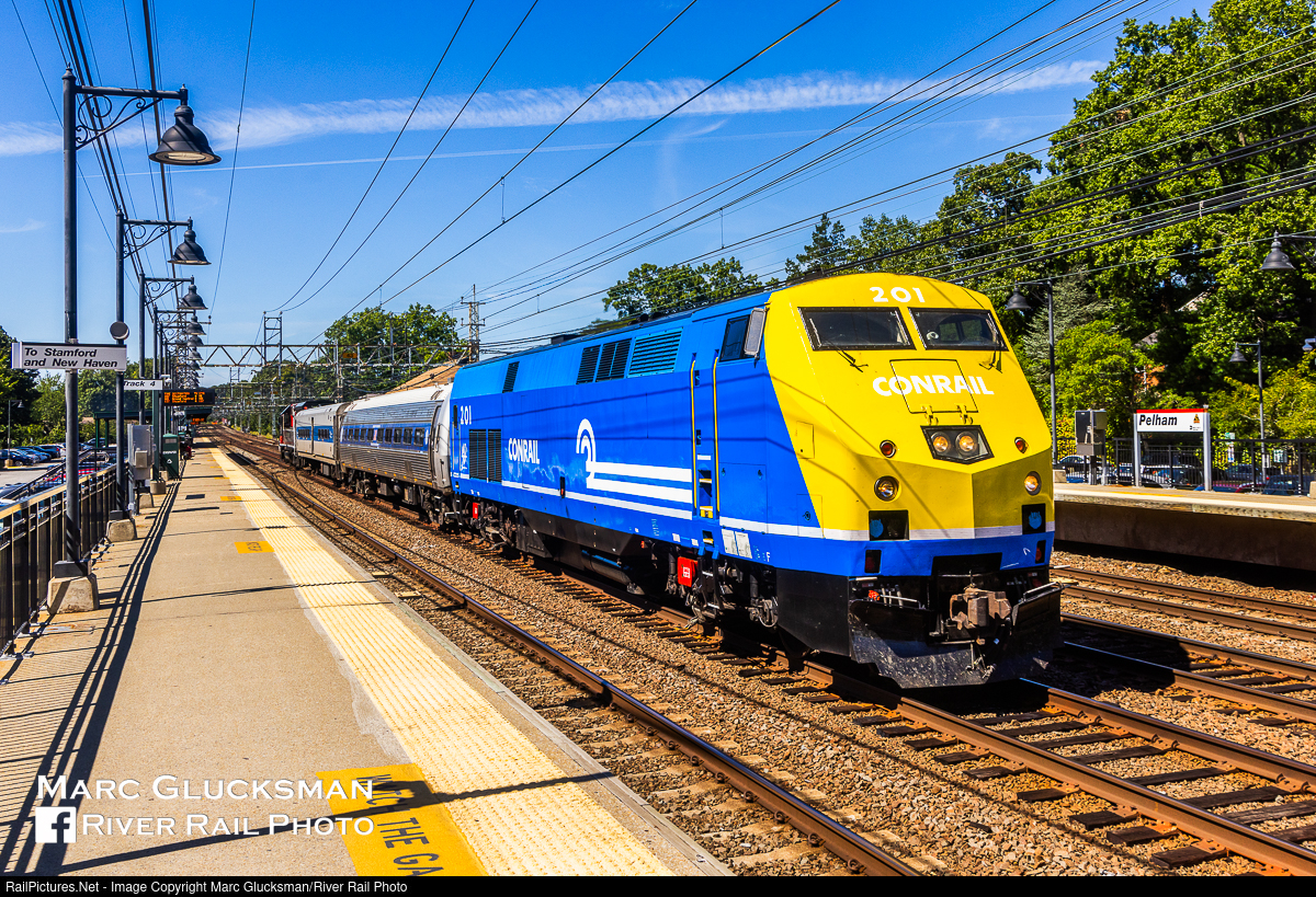 Geometry Train in Pelham. For a week, the consist of MNCW 201 (40th Anniversary/MTA-Conrail)-DOTX 216 (Geo/Metroliner)-MNCW 6331 (Shoreliner III)-MNCW 129 (BL20GHM) traveled the system MTA Metro-North Railroad system inspecting the track. U.S. Department of Transportation/Federal Railroad Administration DOTX 216 was, built by Budd in 1967 as Penn Central 803, was later converted to Amtrak 9642 before coming to the FRA. The DOT states that it "supplement track geometry inspections performed by the Office of Safety cars". The train is double-ended to facilitate changing ends, seen here passing through the MTA Metro-North Railroad Pelham Station.