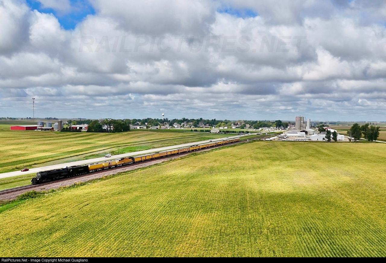 Sometimes a locomotive comes along that is so great and so massive that you have to take to the sky to see it in its full glory. Taken at around 200ft from my drone, we see Big Boy and its magnificent train make its ways eastward towards it's next stop of Grand Mound, Ia through the small Iowa city of Clarence. Fully complemented by the acres of soybeans turning to their fall colors and a small farm, the train is only slightly rivaled by the 250ft tall Purina Feed elevator in the distance. |