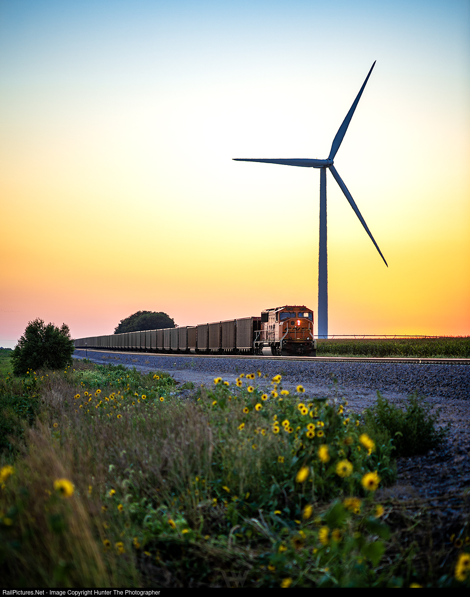 The Power Of Three | The sun, representing the first of three energy sources pictured, has just set behind a wind turbine near Tamora, NE where a westbound train of empty coal hoppers cruises up the Ravenna Subdivision on a glorious Sunday, September 1, 2024 evening.