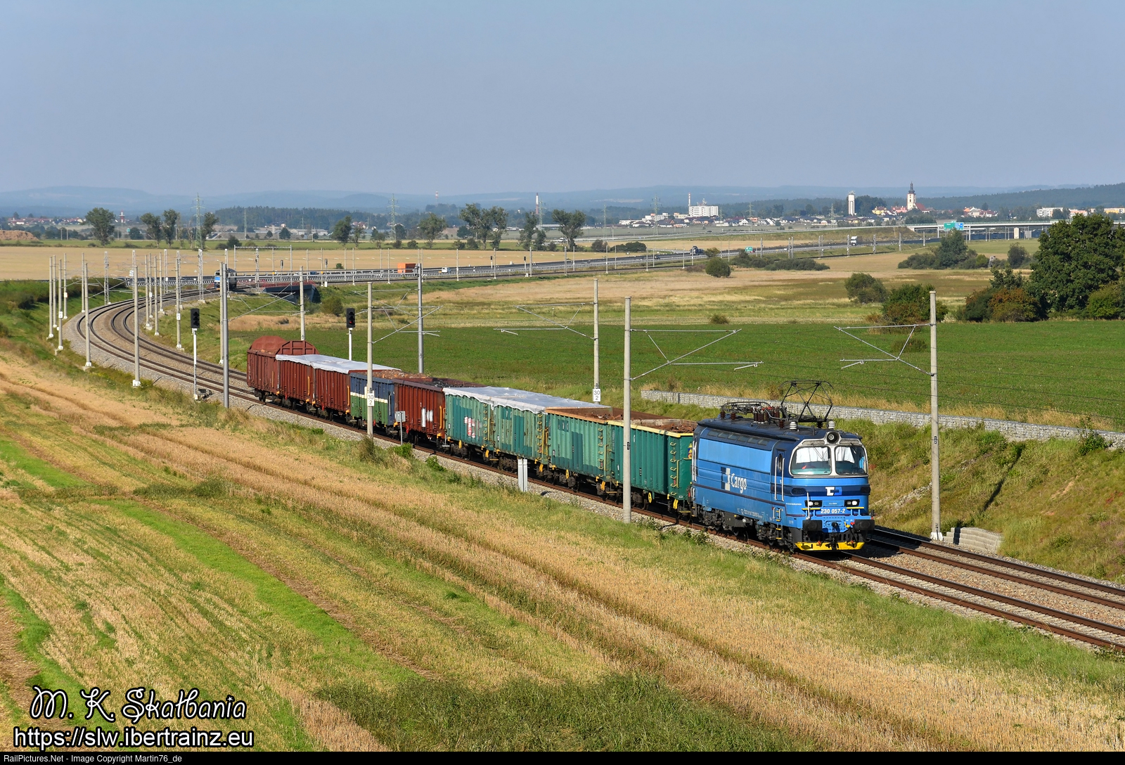 The electric locomotive 230.057-2 hauling a freight train from Jindrichuv Hradec to Ceske Budejovice.