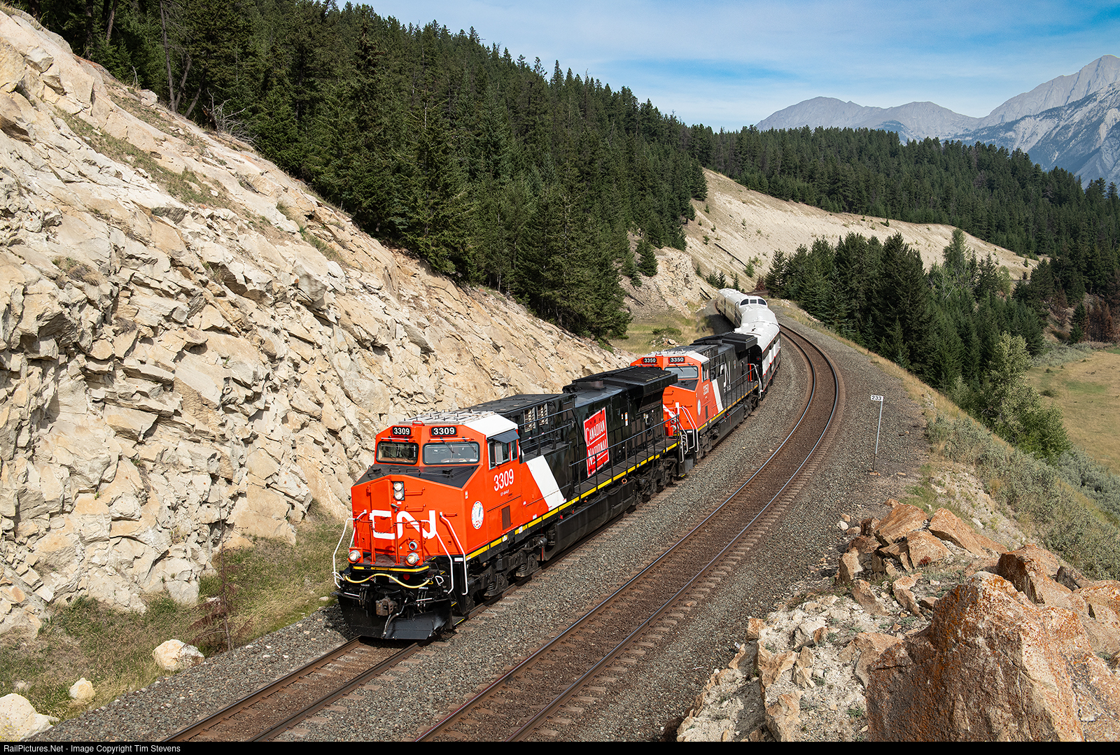 CN AC44C6Ms 3309 and 3350 pull a short 5 car business train westward on the Edson Sub approaching Jasper, AB.