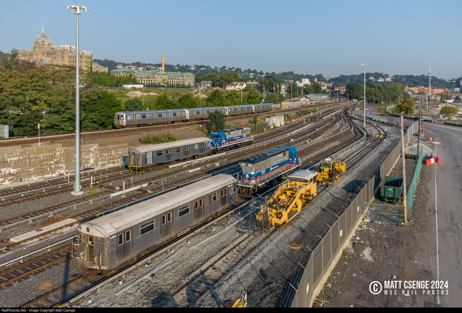 Staten Island Railway R32 car no. 3388 is among a variety of equipment that was seen at the railway's Clifton Yard on the morning of Saturday September 14, 2024. The car is the second R32 to be sent to the island after their retirement from the New York City Subway - the first having been converted into laser car LT001 seen in the background. Also visible are two of the railway's four Brookville BL20G locomotives, 777 and 779, as well as a train of R44 cars heading east to Tottenville on the main line. |
