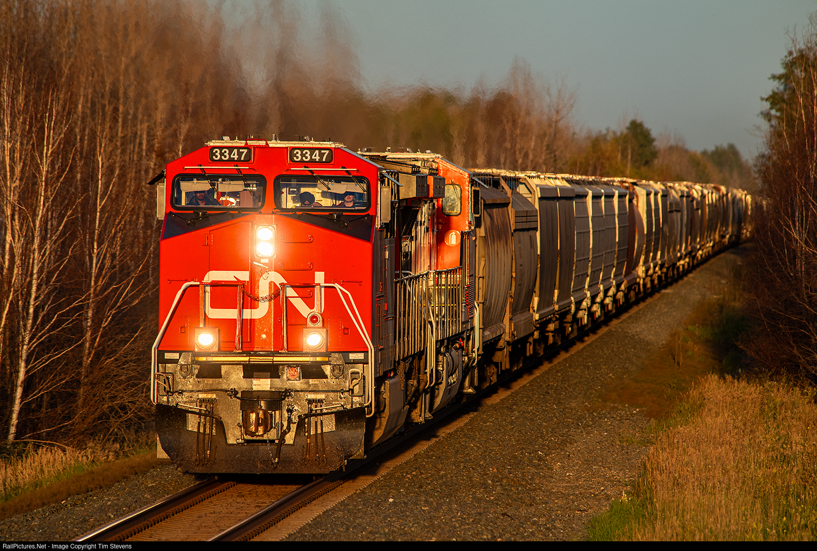 CN AC44C6M 3347 races towards the setting sun leading a loaded grain train.