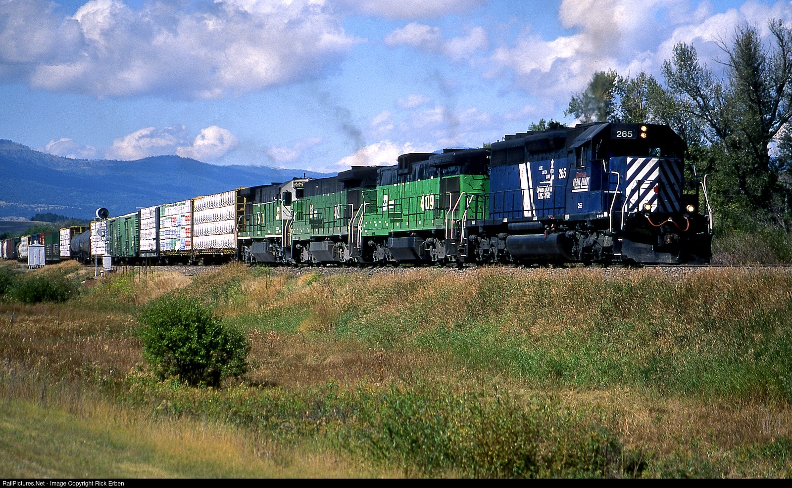 An A-B-B-A set of power was charging up the grade between Avon and Elliston, MT on a beautiful Montana day. The MRL leader is trailed by BN B30-7 B units 4109 and 4107 and C30-7 5521. BN, and later BNSF, overhead traffic was MRLs bread and butter as evidenced by this slick looking manifest. Fuji Velvia.