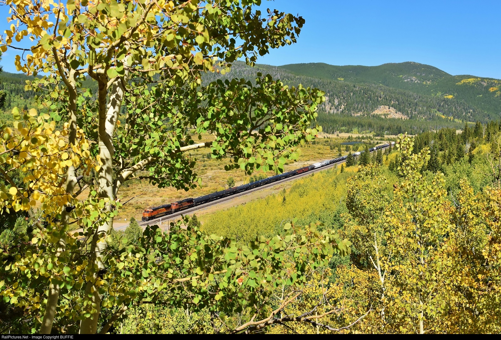 The aspen are turning gold in Tolland, Colorado as BNSF 6379 (ES44AC) waits on a siding for a new crew.