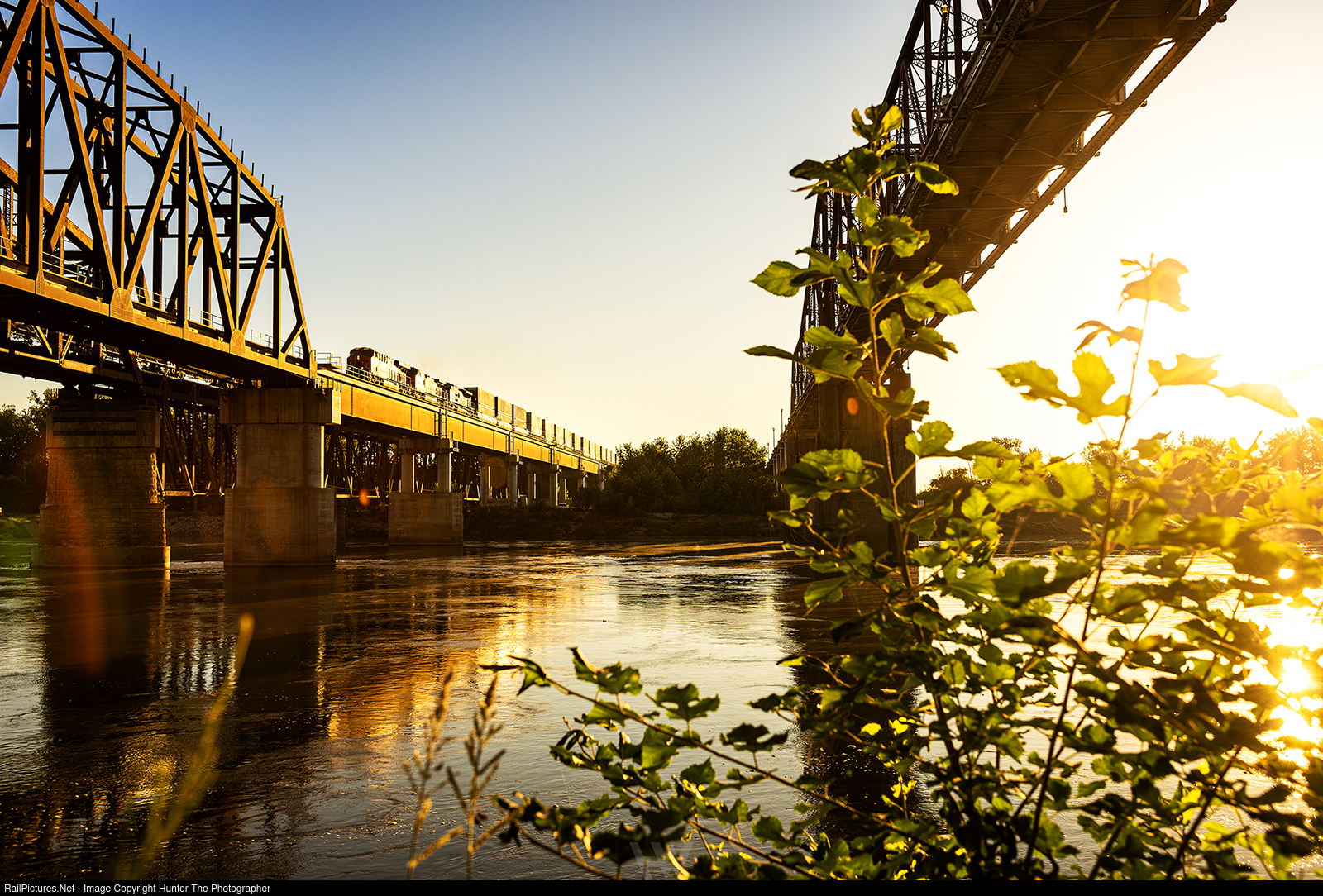 Bridges At Plattsmouth | During golden hour on the morning of Monday, September 2, 2024, a westbound intermodal train crosses one of the bridges over the Missouri River from Iowa into Nebraska near the town of Plattsmouth.