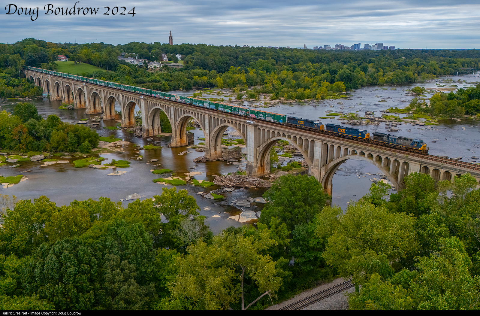 Selkirk, NY to Waycross, GA manifest train M409 is seen heading out of Richmond crossing over the James River Bridge, built by the Atlantic Coast Line in 1919.