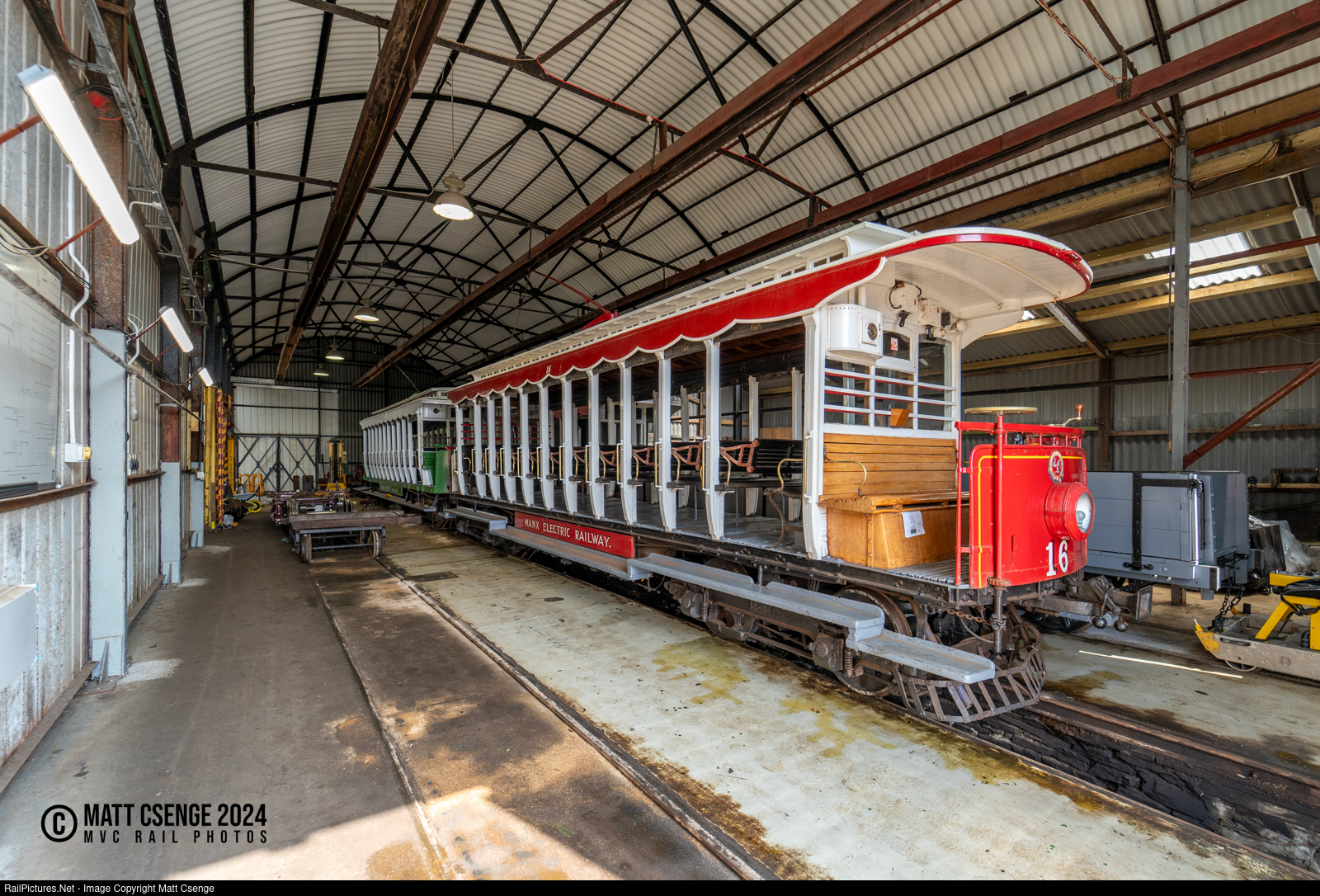 Manx Electric Railway (MER) roofed toastrack car 16, one of five built by G.F. Milnes & Co. in 1898, is seen in the lower shed at the railway's Derby Castle Depot. When they were originally built the "ratchet cars" did not have air brakes, relying only on mechanical handbrakes - which gave them their nickname. Car 16 was eventually outfitted with air brakes; a result of multiple trucks swaps over its lifetime. |