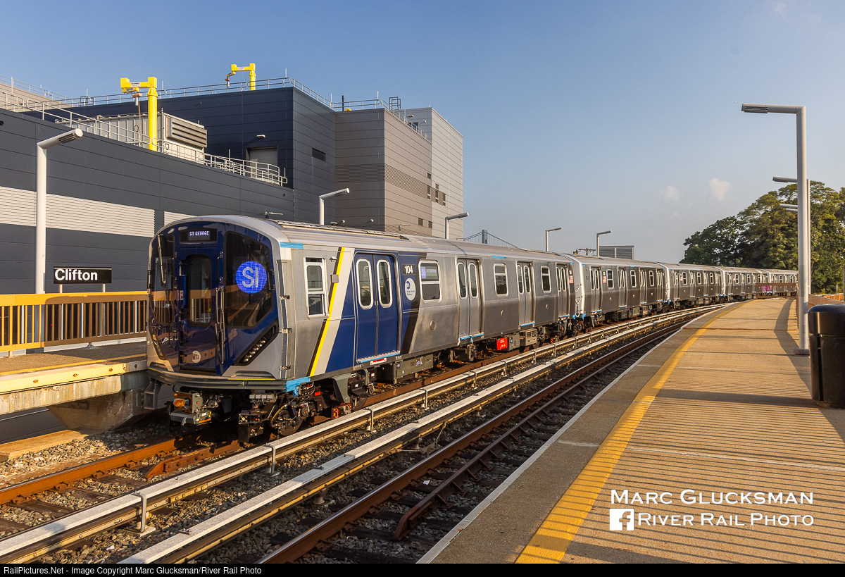 The R-211S. The MTA Staten Island Railway operates on a 14 mile-long 21 station line in Staten Island, New York. The third class of cars built for this line, the Kawasaki R-211S, has started to enter its training phase. This 75 car order of 5-car sets will be the replacement for the 1971-1973 St. Louis Car Company built R-44S/ME-2 fleet (originally 52 cars, later supplemented with 12 former MTA NYCT Subway R-44 cars). There are few differences between the R-211A cars operating on the "A Line" and these R-211S cars, the main one is that the R-211S cars have ATC (track-circuit-based automatic train control) and the R-211A have CBTC (communications-based train control). On Saturday, September 14, 2024, the first 5-car set to be delivered (SIR 100-104) was out in daylight during a training/familiarization run, seen here passing through the Clifton Station.