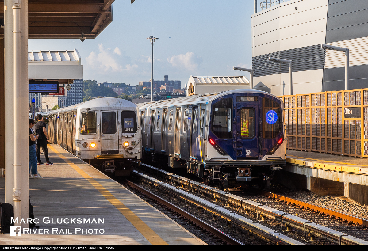 The R-44S And The R-211S. The MTA Staten Island Railway operates on a 14 mile-long 21 station line in Staten Island, New York. The third class of cars built for this line, the Kawasaki R-211S, has started to enter its training phase. This 75 car order of 5-car sets will be the replacement for the 1971-1973 St. Louis Car Company built R-44S/ME-2 fleet (originally 52 cars, later supplemented with 12 former MTA NYCT Subway R-44 cars). There are few differences between the R-211A cars operating on the "A Line" and these R-211S cars, the main one is that the R-211S cars have ATC (track-circuit-based automatic train control) and the R-211A have CBTC (communications-based train control). On Saturday, September 14, 2024, the first 5-car set to be delivered (SIR 100-104) was out in daylight during a training/familiarization run, seen here passing through the Clifton Station.