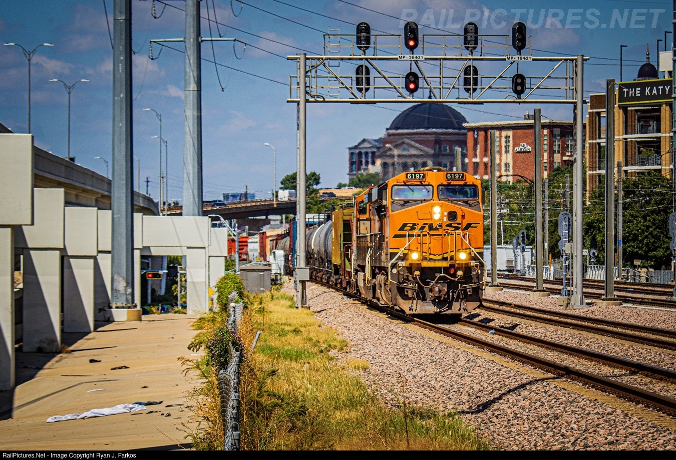 | While waiting the Texas Eagle, BNSF 6197 brings the daily Tulsa to Teague manifest down towards JFK Junction before holding for opposing Union Pacific traffic |