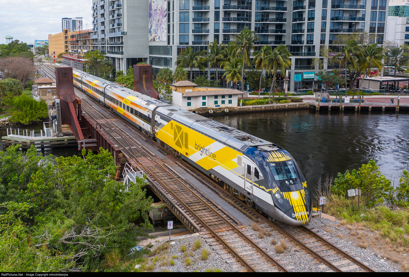 | After completing the station stop in Fort Lauderdale, Florida Brightline train 726 is accelerating south with SCB-40 114 in the lead of the orange trainset. The train is crossing over the New River on a double tracked drawbridge in an area that is seeing massive new construction projects as the city grows. |