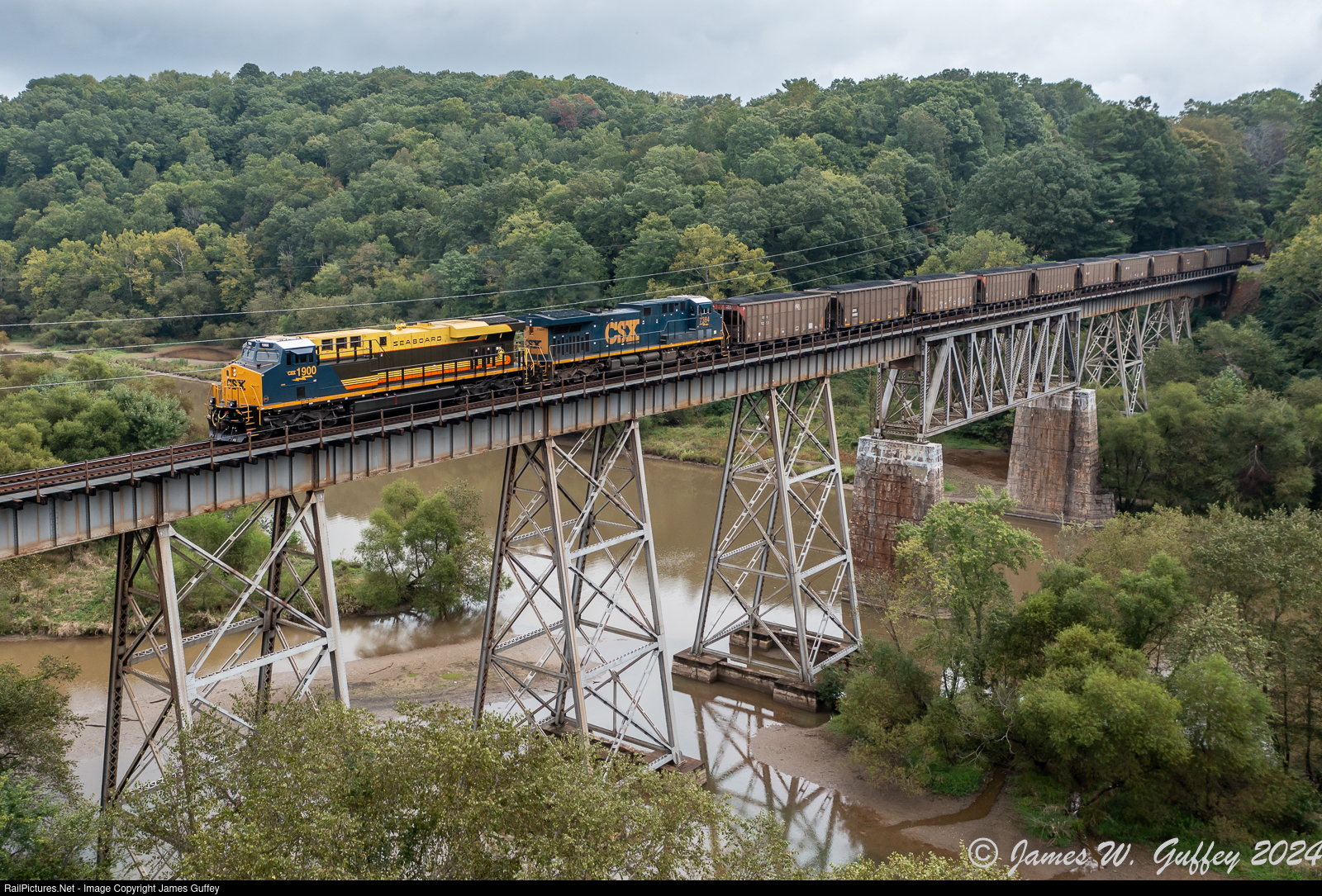 DPU's on a southbound coal train for Duke Energy at Brice shove over the Catawba River and Lake James on the former Clinchfield, with the Seaboard heritage unit bringing up the rear.