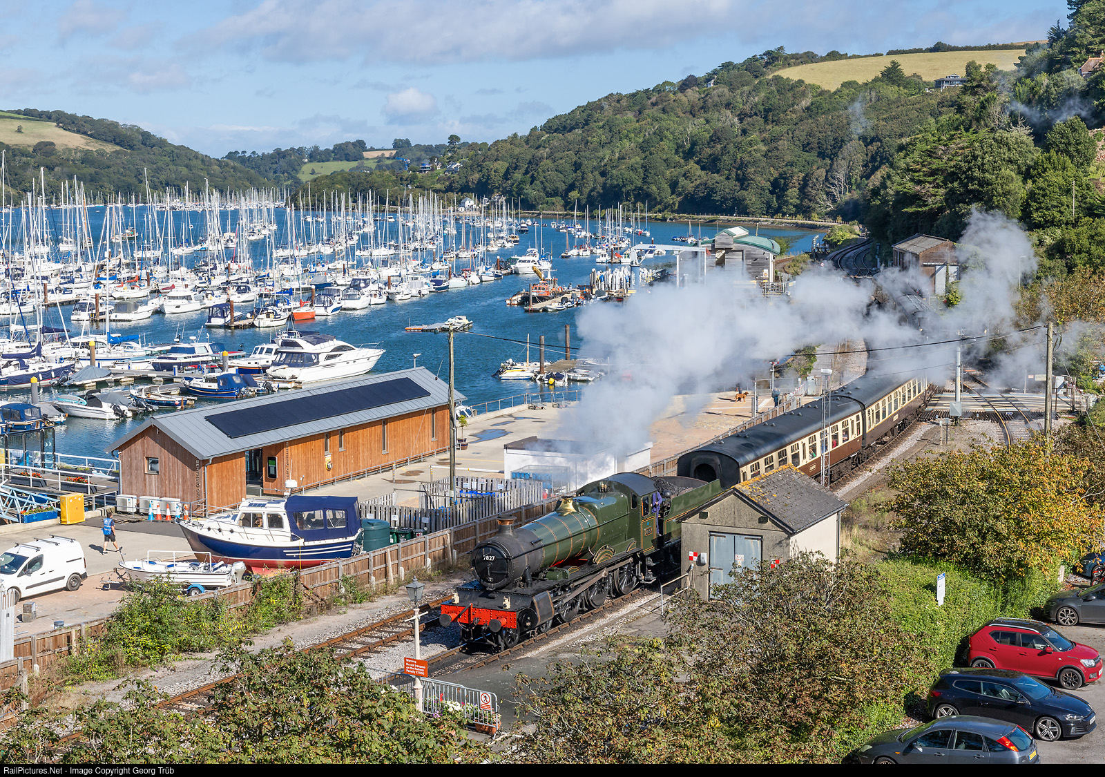 4-6-0 steamlocomotive # 7827 LYDHAM MANOR of the Dartmouth Steam Railway (DSR) is entering Dartmouth with the 10.35 h h train Paignton to Dartmouth. The locomotive of the GWR Class 7800 was built in Swindon in 1950 and is on the Dartmouth Steam Railway since 1973 already.