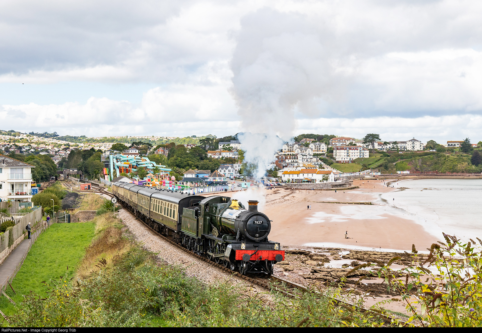 4-6-0 steamlocomotive # 7827 LYDHAM MANOR of the Dartmouth Steam Railway (DSR) pulls the 14.55 h train Paignton to Dartmouth near Goodrington Sands. The locomotive of the GWR Class 7800 was built in Swindon in 1950 and is on the Dartmouth Steam Railway since 1973 already.