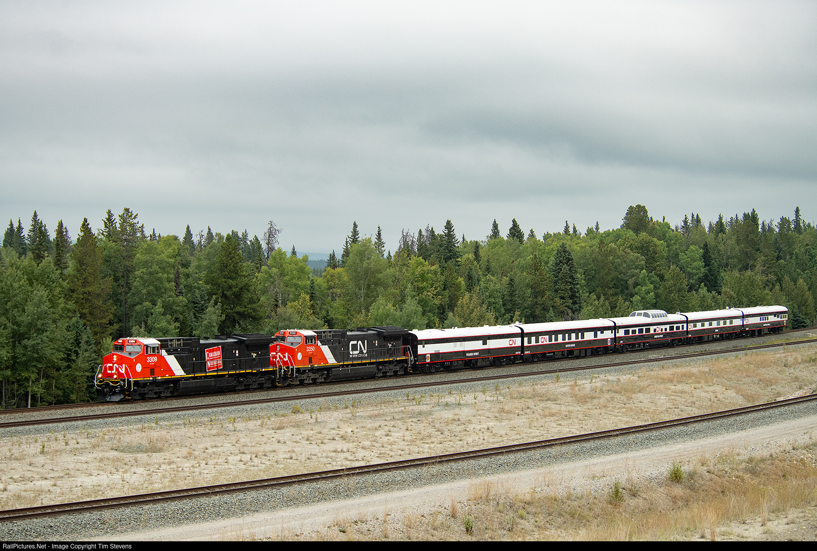 CN AC44C6Ms 3309 and 3350 rocket down the hill at Pedley with CN's business cars.