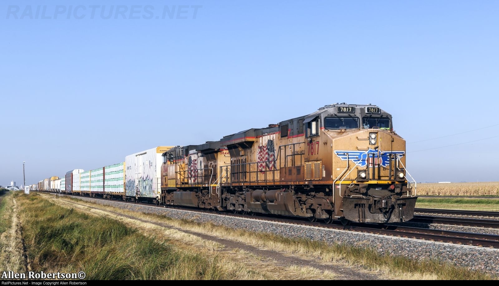 UP 7817 & 5844 lead an eastbound mixed freight.