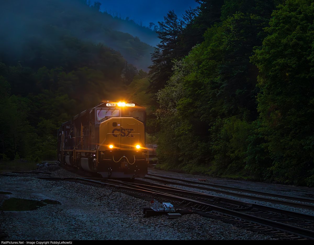 In the early morning hours, CSXT 4764, an SD70MAC fresh rebuild, leads empty grain train CSX G228 westbound through Alleghany, Virginia, along the CSX Alleghany Subdivision.