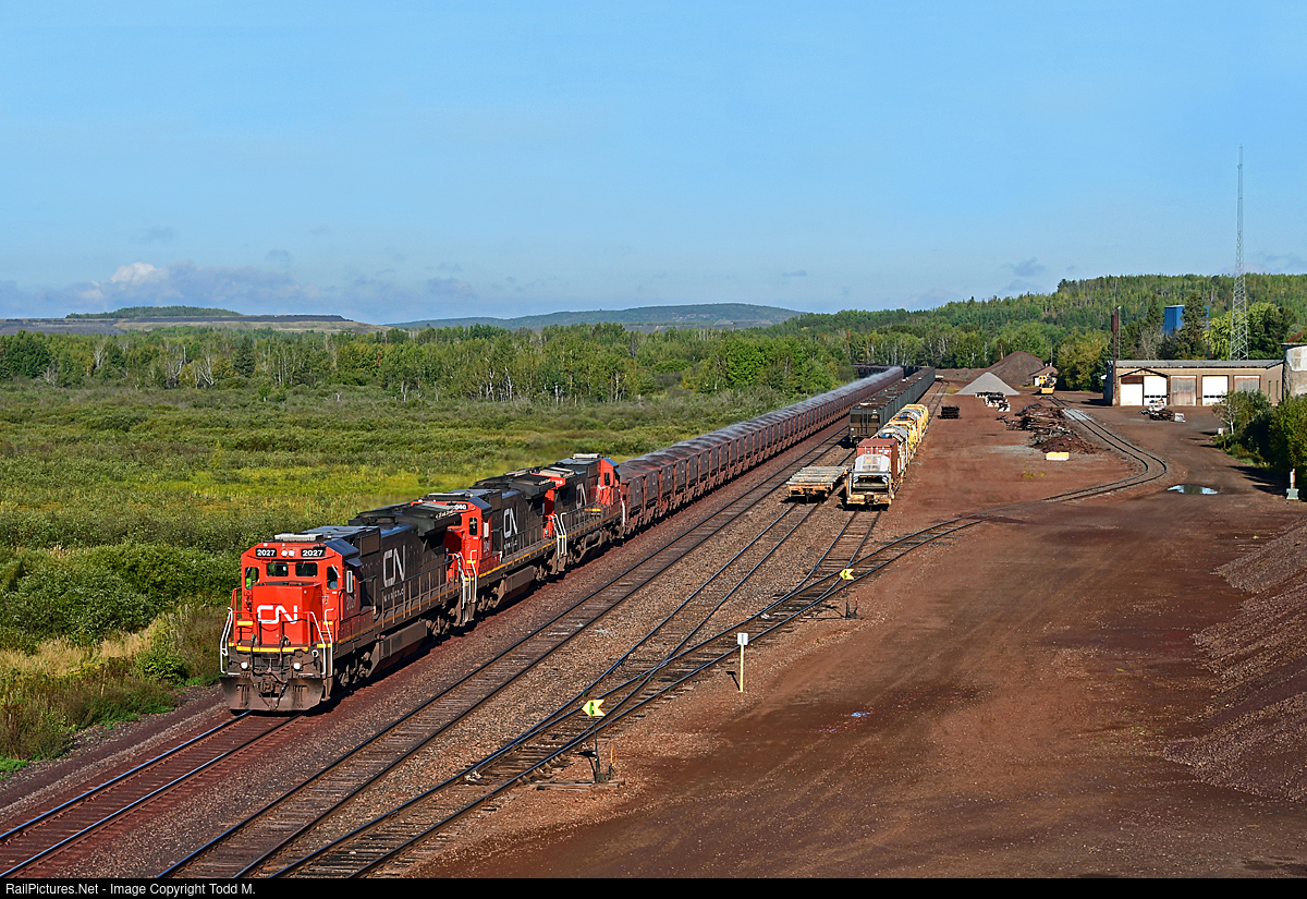 | Pellets from the Minorca mine make their way south on the CN Iron Range sub at Biwabik with evidence of operations from the mine visible in the background. Also interesting is the Plasser-Theurer pieces of M.O.W. equipment parked near the old Missabe enginehouse. |