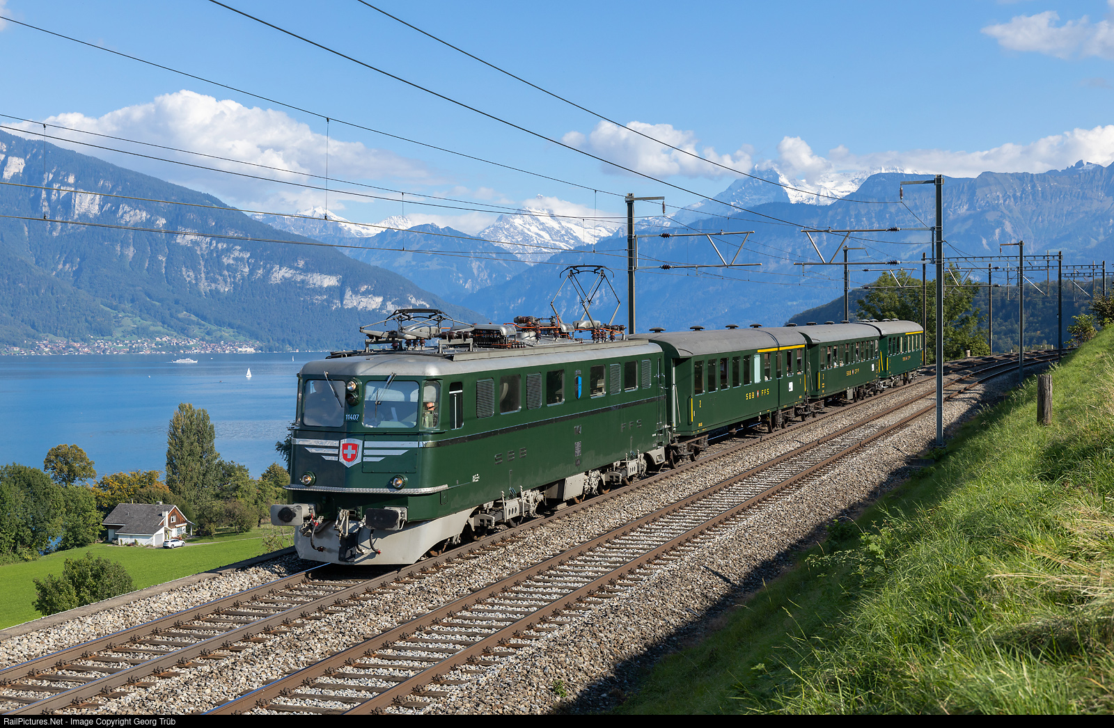 | The "Whisky Train" is on the way back home from Interlaken Ost to Rapperswil along the Thunersee between Speiz and Gwatt. Ae 6/6 # 11407 "Aargau" of SBB Historic, on long term loan to association Mikado 1244 in Brugg AG, pulls three former SBB passenger cars of the Railvetica, based in Rapperswil. The journey was from Interlaken Ost via Spiez-Thun-Zollikofen-Burgdorf-Olten-Brugg-Zürich HB tracks 31 to 34-Zürich Oerlikon-Uster to Rapperswil. |