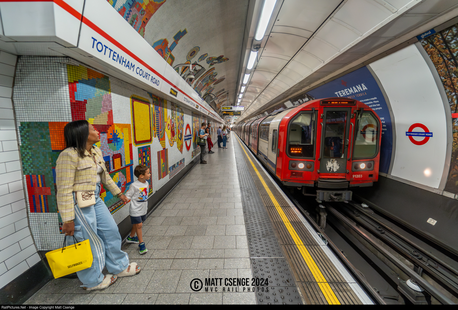Mosaics on the Metro. London Underground 1992 stock car 91203 is the lead unit on a Central Line train seen arriving at Tottenham Court Road Station, while a young boy excitedly looks on. The mosaics on the wall are a 1982 art installation by Eduardo Paolozzi, which were designed to represent the area's high concentration of hi-fi and electronic shops.