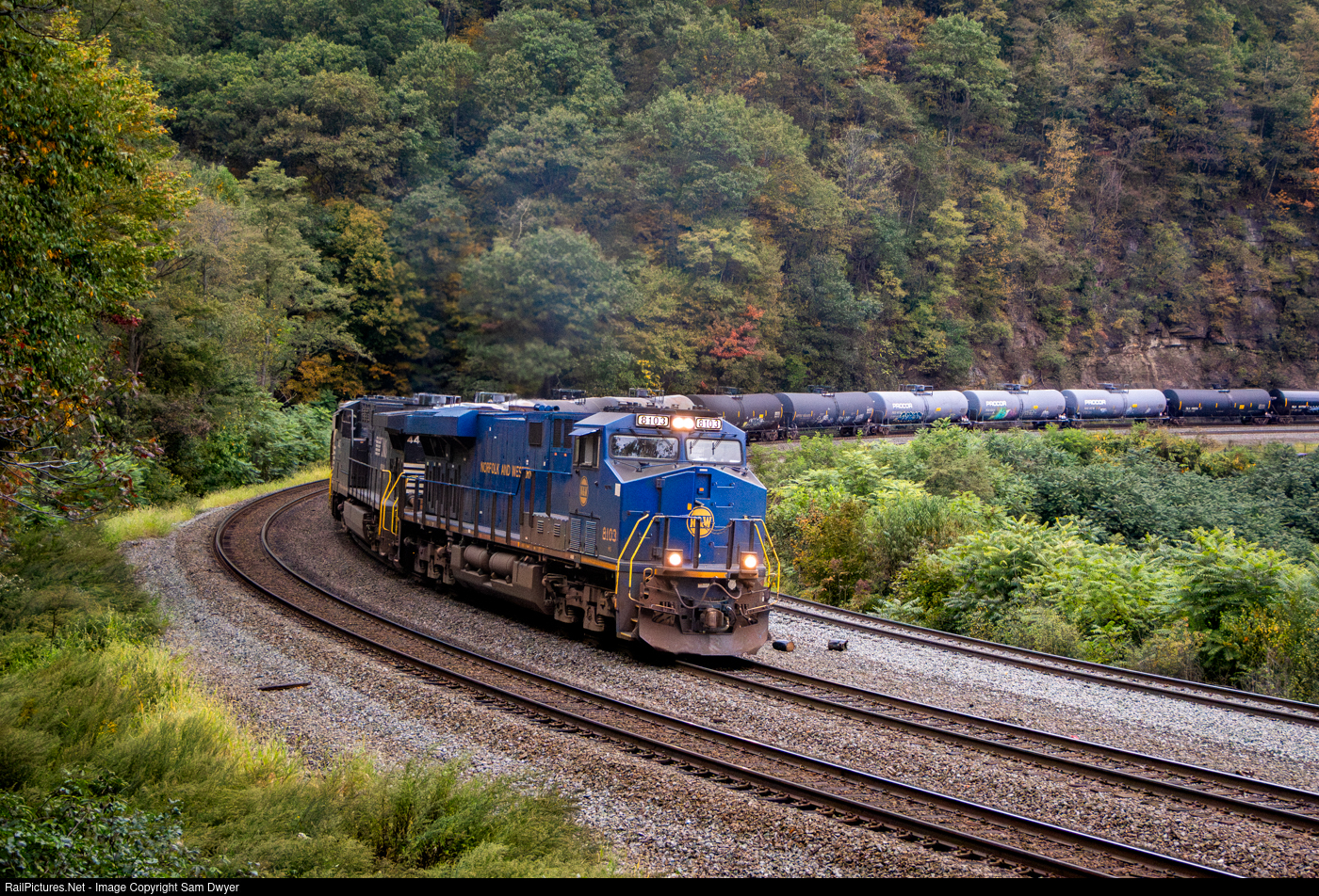The Norfolk and Western heritage unit leads an empty ethanol train up the hill.