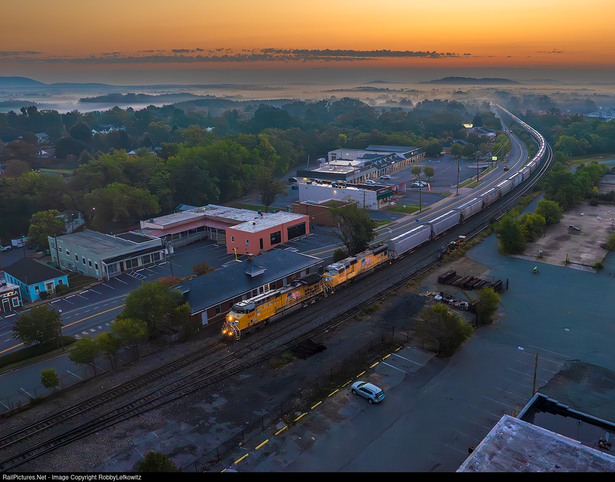 As the fog gives rise to the sun, UP 6691 leads empty grain train CSX G102 westbound along the Buckingham Branch through Crozet, Virginia. The train is passing the old Crozet Station Depot. |