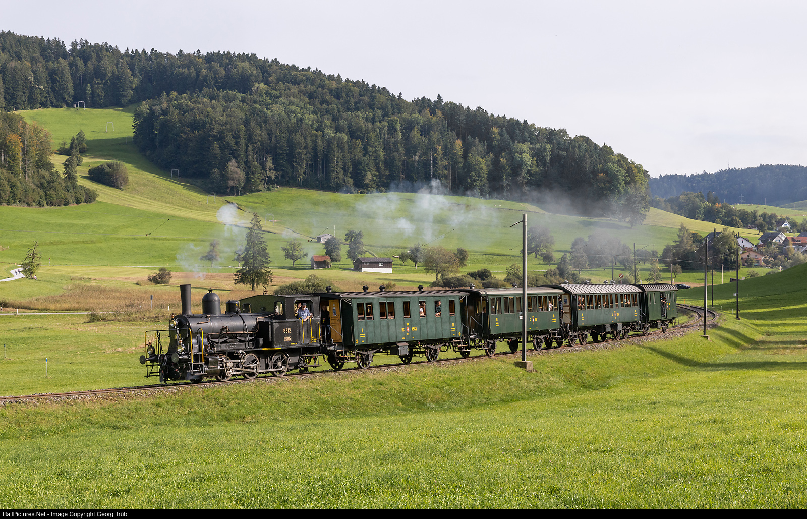 | Former SBB E 3/3 # 8512 of the association steam group Zürich (VDZ Verein Dampfgruppe Zürich), as guest locomotive on the DVZO, pulls train 31163 from Hinwil to Bauma between Bäretswil and Neuthal, on the line of the Dampfbahn Verein Zürcher Oberland (DVZO). |