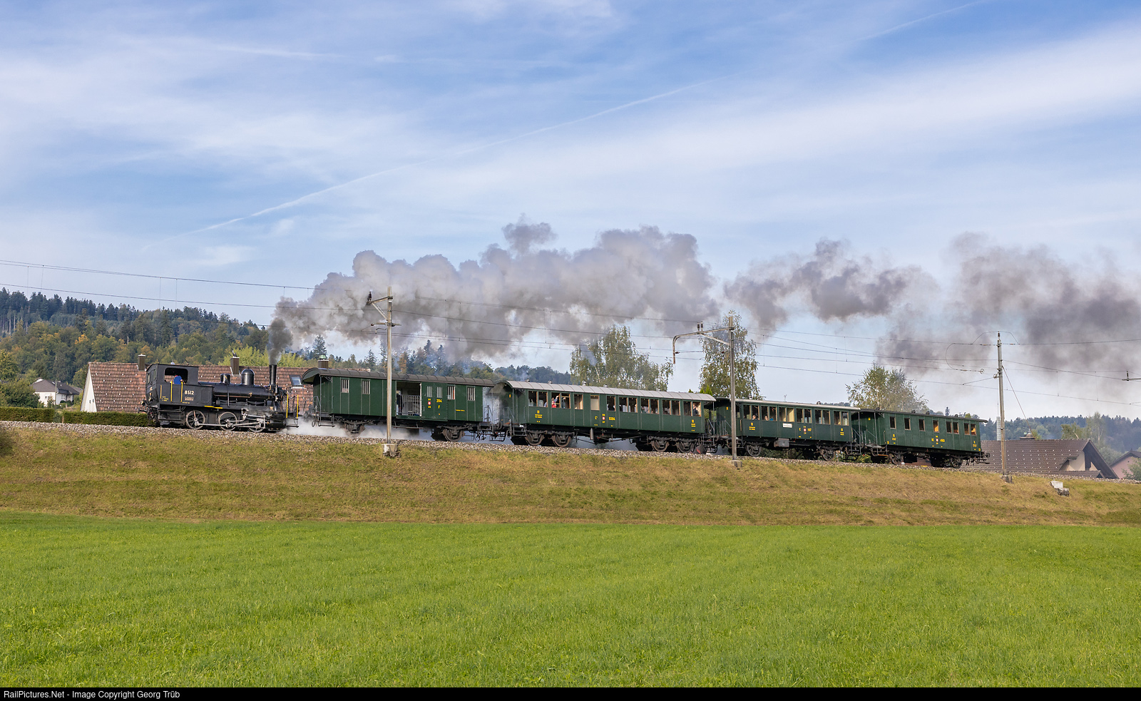 | Former SBB E 3/3 # 8512 of the association steam group Zürich (VDZ Verein Dampfgruppe Zürich), as guest locomotive on the DVZO, is pulling train 31128 from Bauma to Hinwil, on the line of the Dampfbahn Verein Zürcher Oberland (DVZO). |