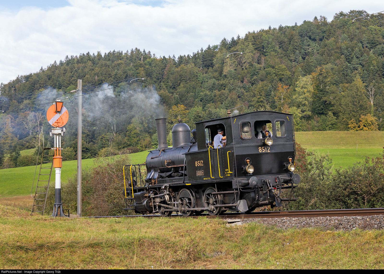 Former SBB E 3/3 # 8512 of the association steam group Zürich (VDZ Verein Dampfgruppe Zürich), was guest locomotive on the DVZO for two weeks. Now the 0-6-0 T "Tigerli" is runing light from Bauma to Hinwil, passing the outer signal of Neuthal, a Hippsche Wendescheibe. From Hinwil to Brugg AG, the # 8512 was pulled by Ae 6/6 # 11407 of SBB Historic, on long term loan to association Mikado 1244.