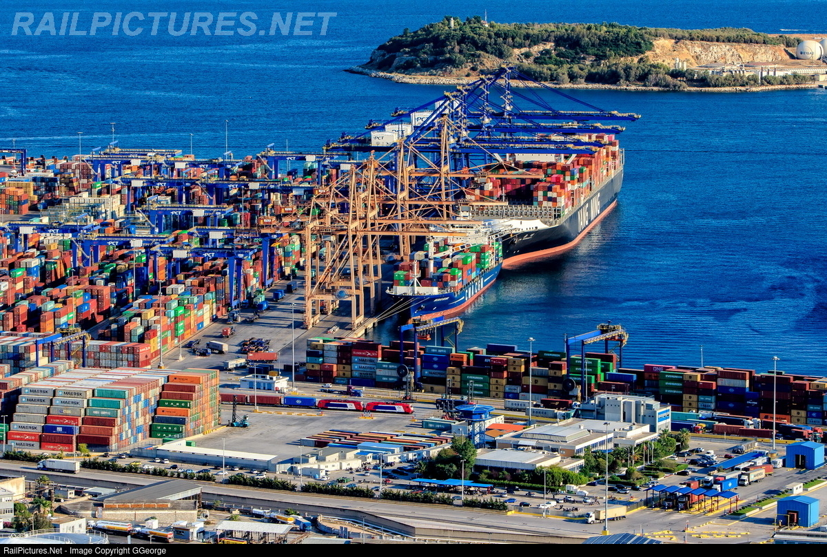 A panoramic photo from the port Ikonio in Piraeus. Inside the harbor you can see a freight train with two units ADtranz DE2000 preparing to leave for central Europe