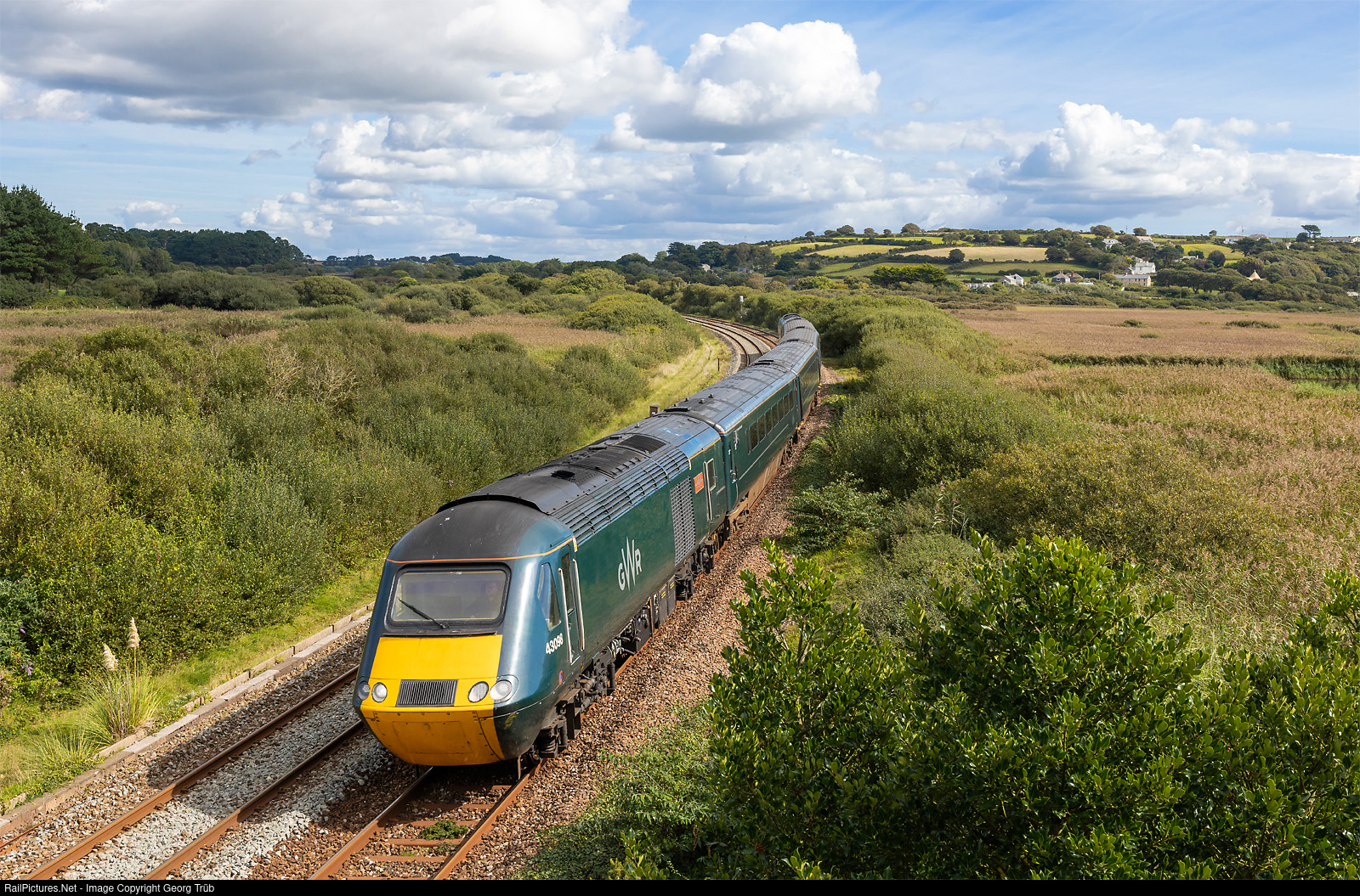 "HST125" of the "Castle Class" of the Great Western Railway is running as train 2C65 from Plymouth to Penzance over the Cornish mainline, between St Erth and Penzance, nera the former Marazion station. Power car 43 # 098 "Walton Castle" is in front and 43 # 186 "Taunton Castle" in the rear. This trains were shortened to 4 intermediate cars with automatic doors and second class only for the services between Plymouth and Penzance and are based in Plymouth Laira depot, and are due to withdraw. The trains, still approved for 125 mph (200 km/h), travel at a maximum of 75 mph here, but mostly in the 65 mph (105 km/h) range. The two diesel power cars of class 43 with MTU engines each have an output of 1678 kW (2250 HP).