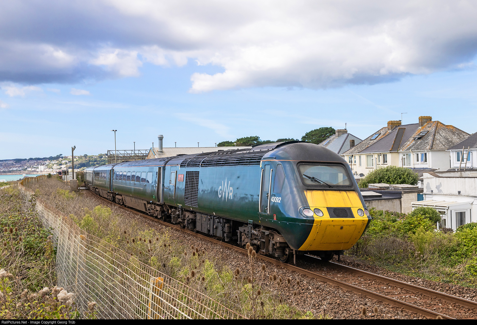 "HST125" of the "Castle Class" of the Great Western Railway is running as train 2C11 from Plymouth to Penzance, between St Erth and Penzance. Power car 43 # 093 "Berkeley Castle" (with special paint scheme "Legends of the Great Western Railway") is in front and 43 # 092 "Cromwell's Castle" in the rear. This trains were shortened to 4 intermediate cars with automatic doors and second class only for the services between Plymouth and Penzance and are based in Plymouth Laira depot. The trains, still approved for 125 mph (200 km/h), travel at a maximum of 75 mph here, but mostly in the 65 mph (105 km/h) range. The two diesel power cars of class 43 with MTU engines each have an output of 1678 kW (2250 HP).