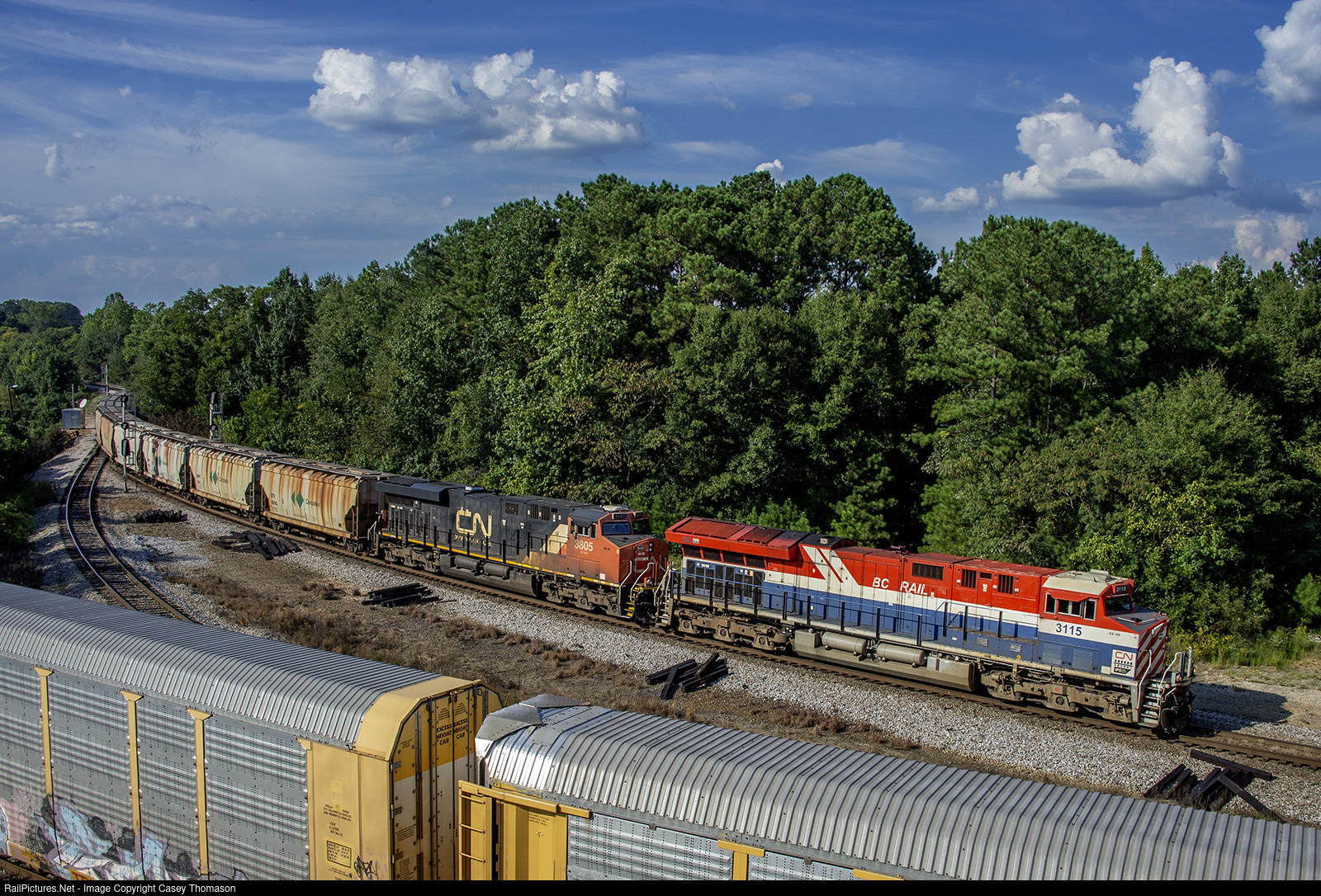 | CN's BC Rail heritage unit leads 17,000 tons of potash south into Manchester, Georgia, on CSX train B24120. |
