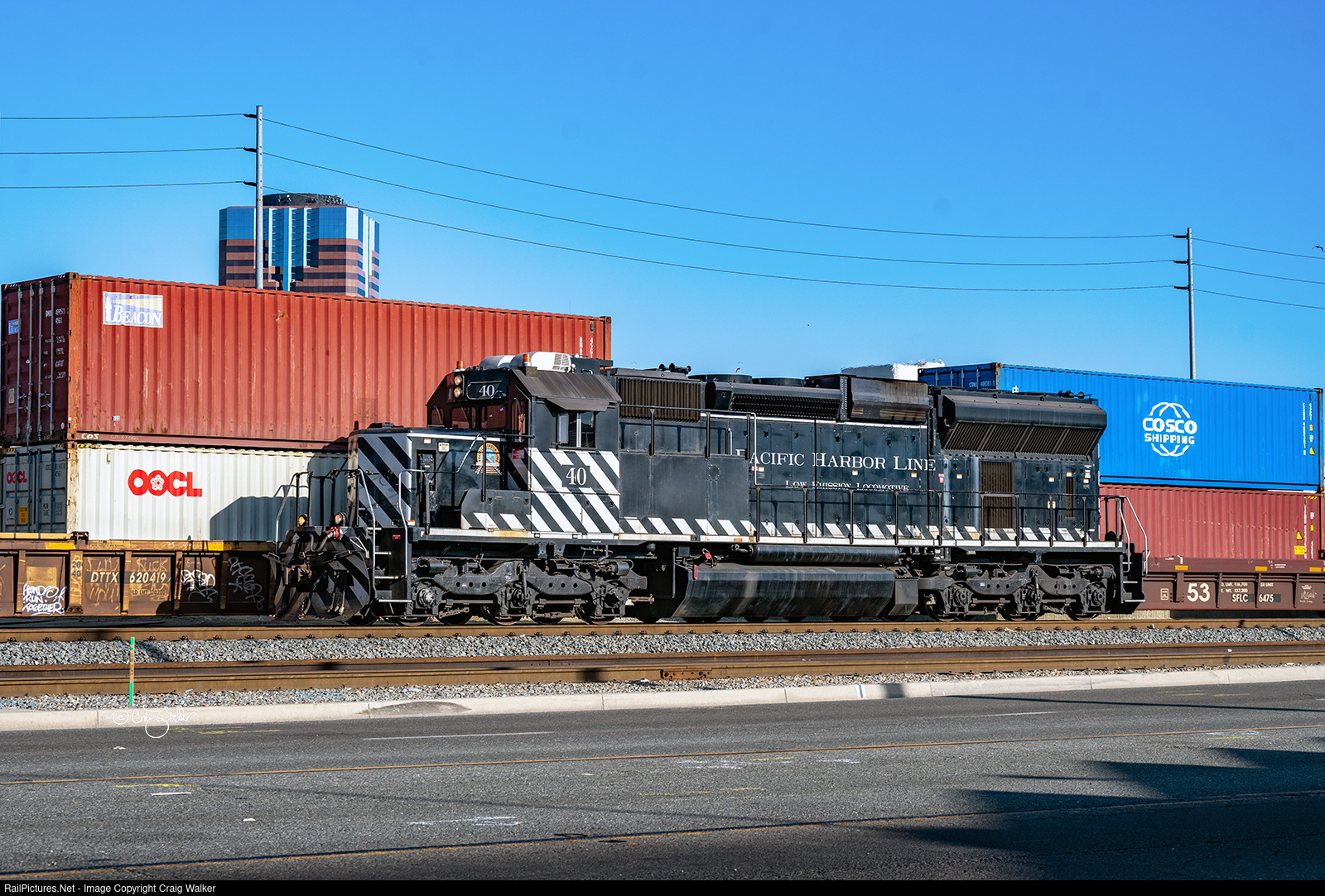 | Heading to Pacific Harbor Line's Pier B Yard is PHL PR30C 40. This locomotive was built by Progress Rail using the former Canadian Pacific SD40-2 5819 as a starting point, originally numbered PRLX 3006 before being sold to PHL. (Long Beach, California – September 19, 2024) |