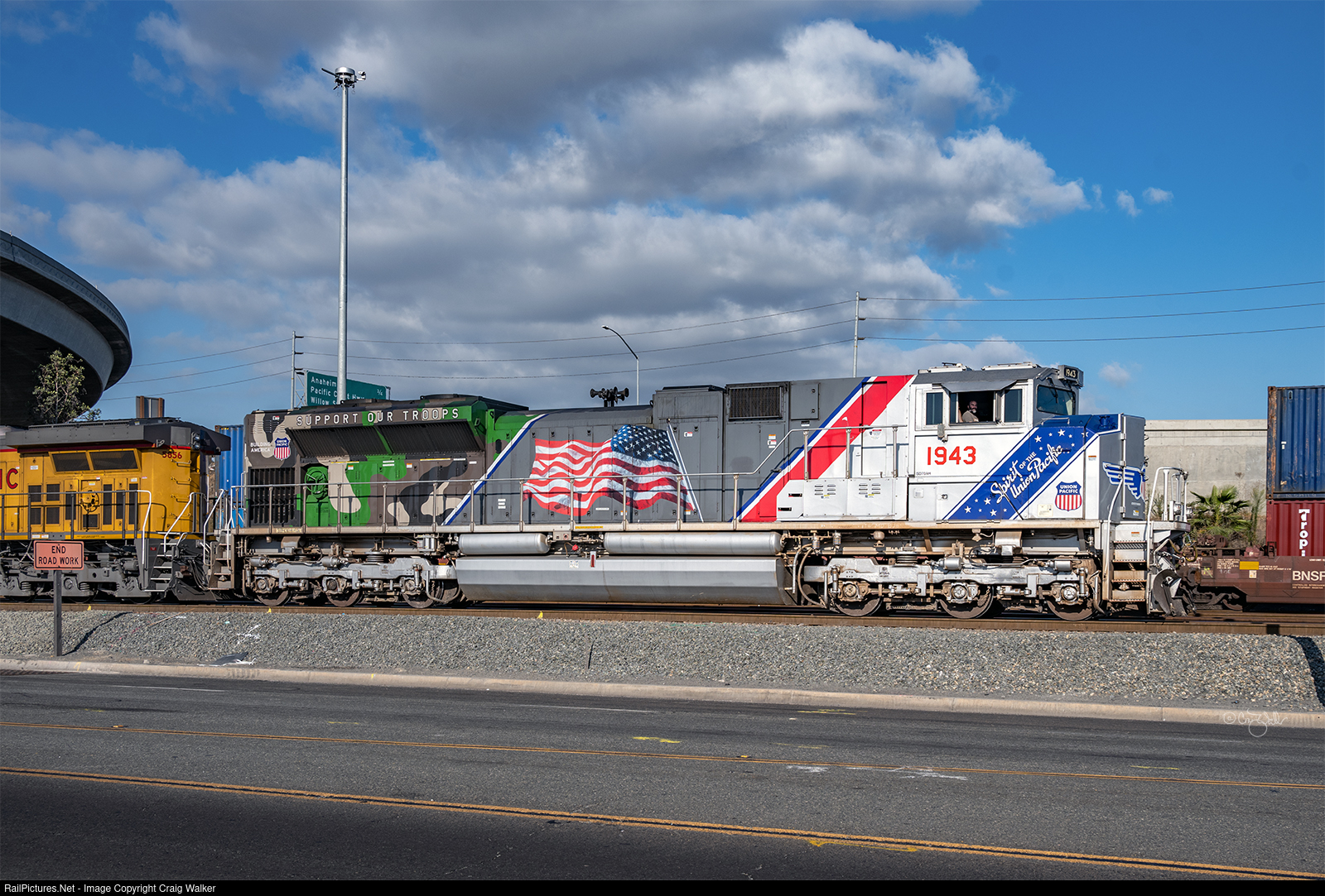 Constructed in April 2016 by General Motors Electro-Motive Division as Union Pacific SD70ACe 9026, the next year this locomotive was chosen by UP to be repainted and renumbered to UP 1943 as the company's 16th commemorative locomotive to honor the United States' armed forces and the men and women filling their ranks. Dubbed "Spirit of the Union Pacific" and repainted into this special paint scheme.
