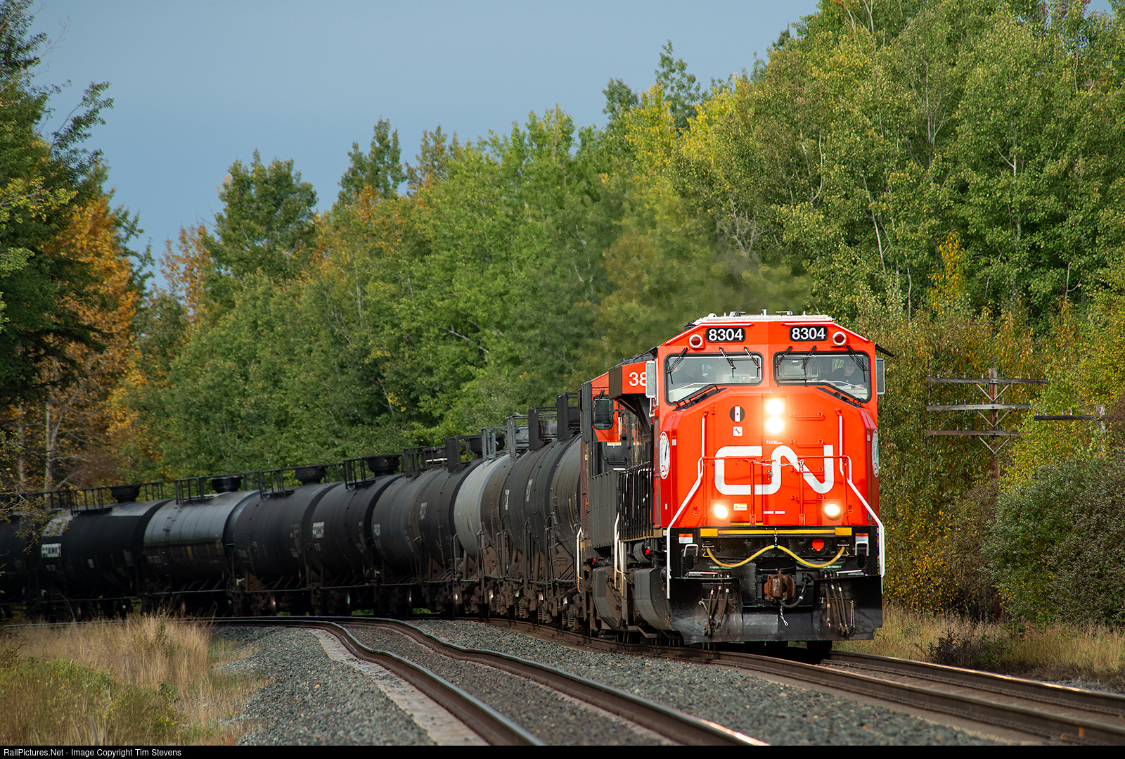 Empty LPG tanks head back towards the Alberta Heartland led by fresh CN SD75IACC 8304.
