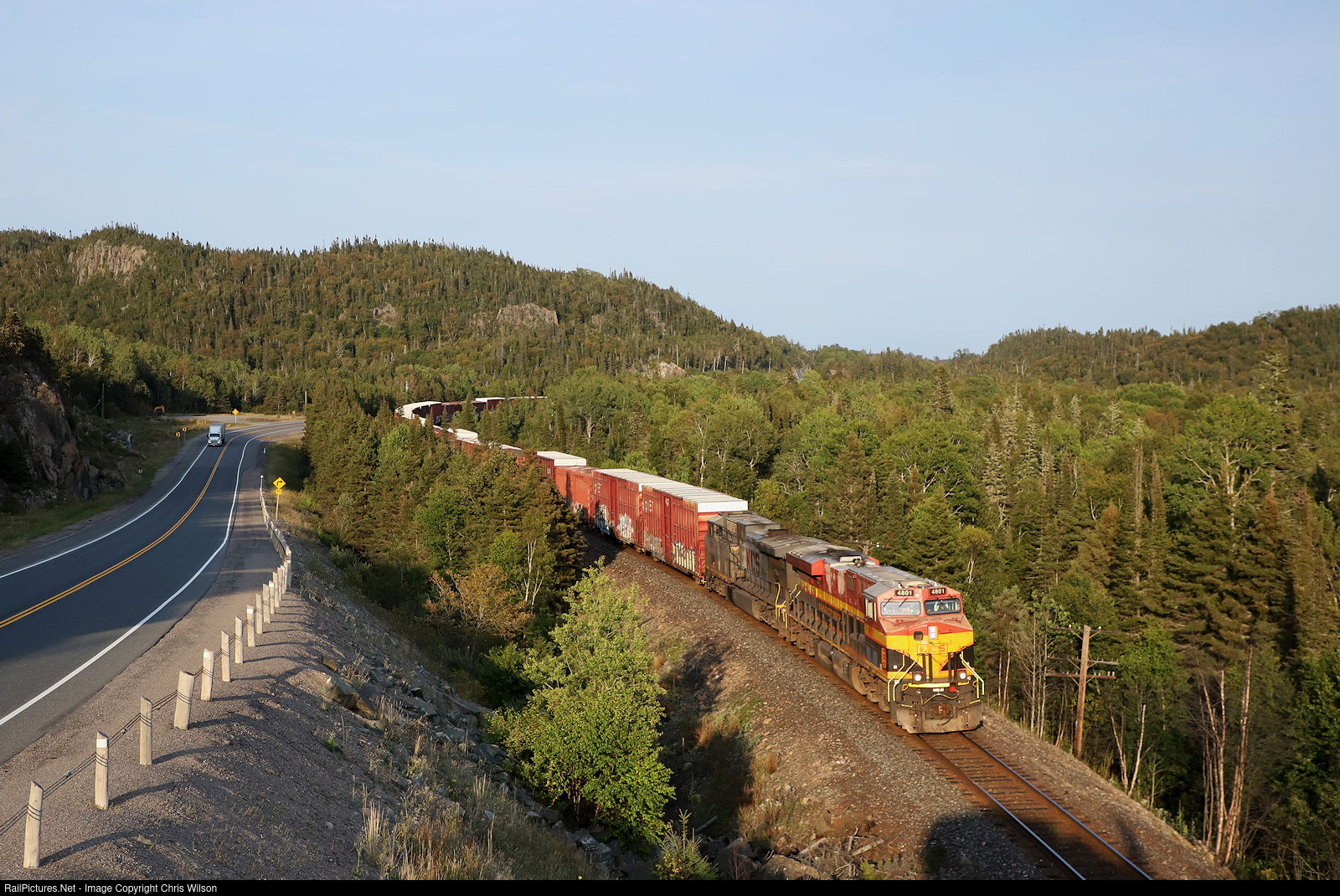 CPKC's Toronto to Winnipeg 421 heads west beside the Trans Canada Highway with a pair of KCS locomotives upfront.